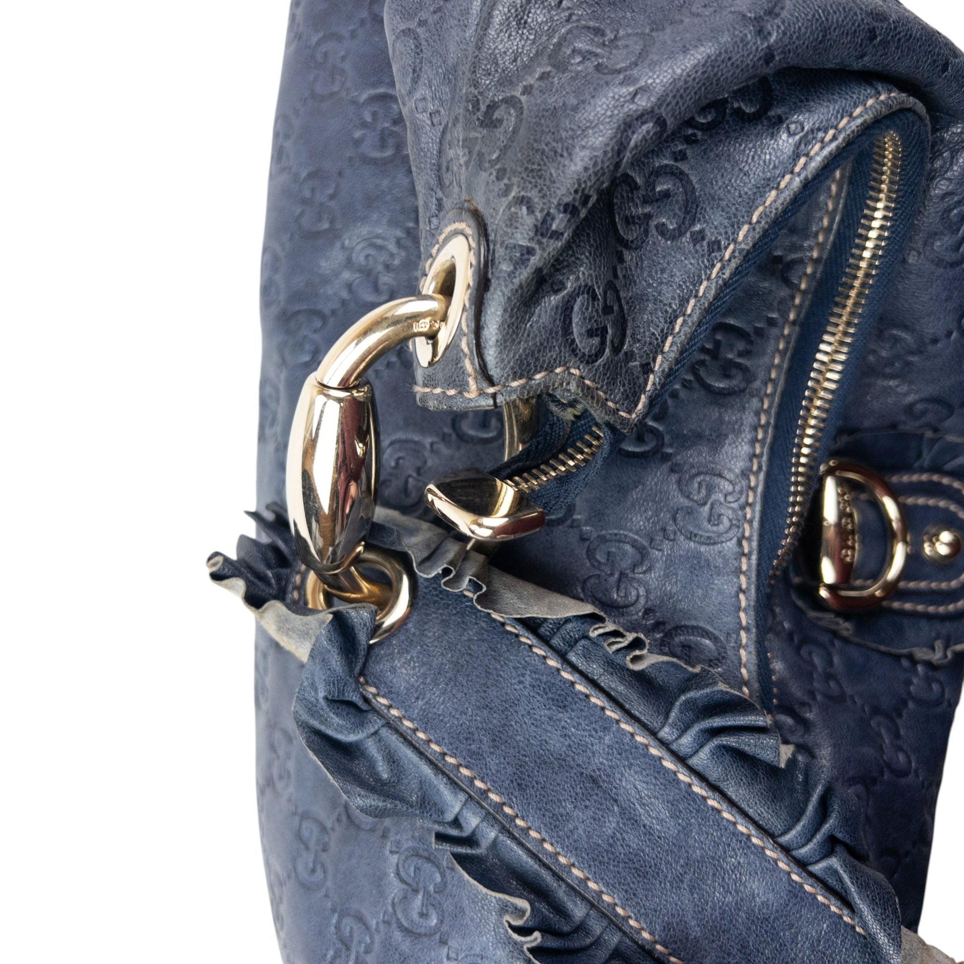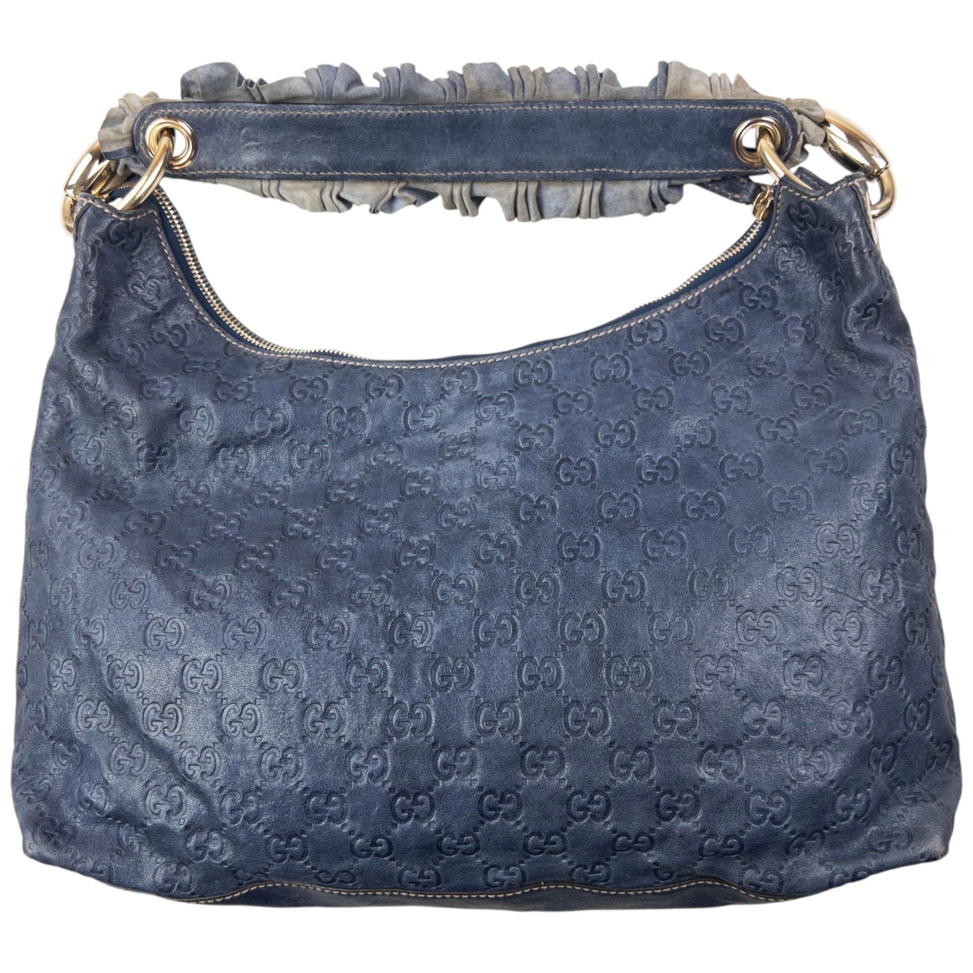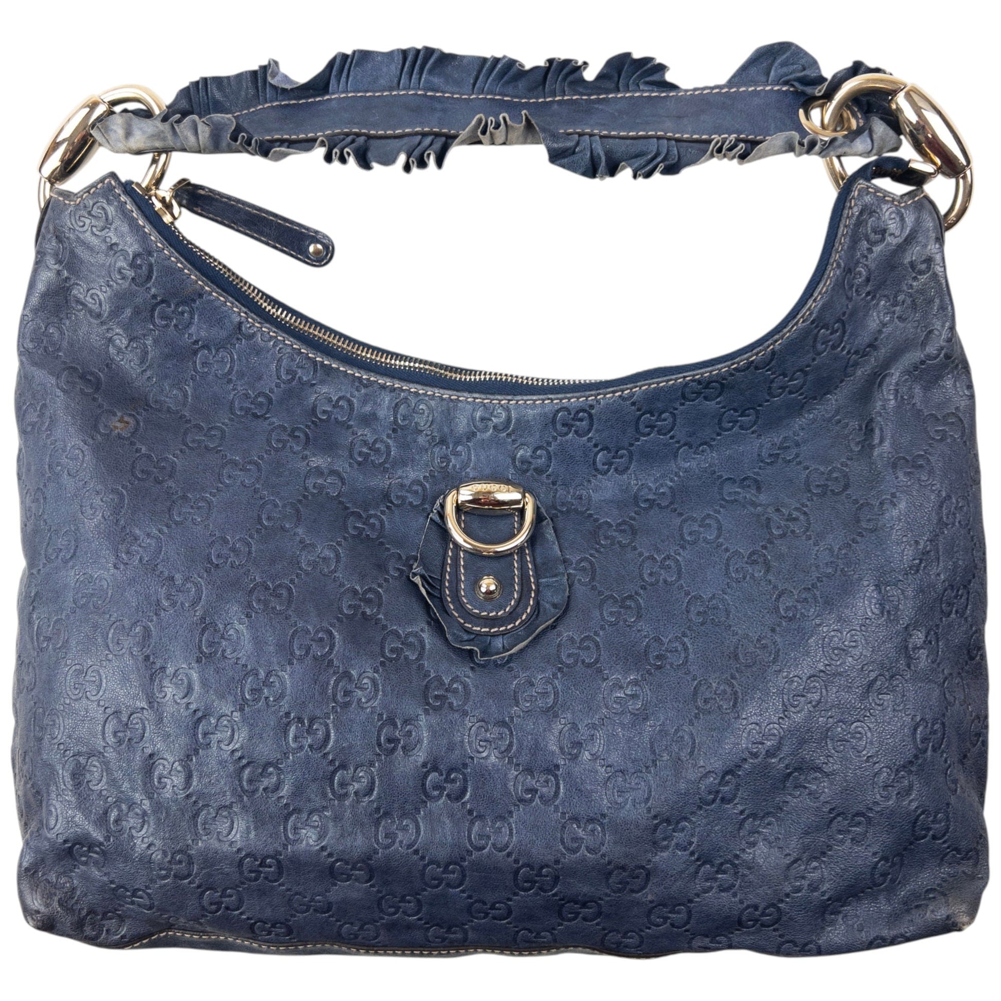 • Other info: Blue colour, gold accent colour, embossed monogram logo pattern, ruffle trim handle, marks and general wear as shown