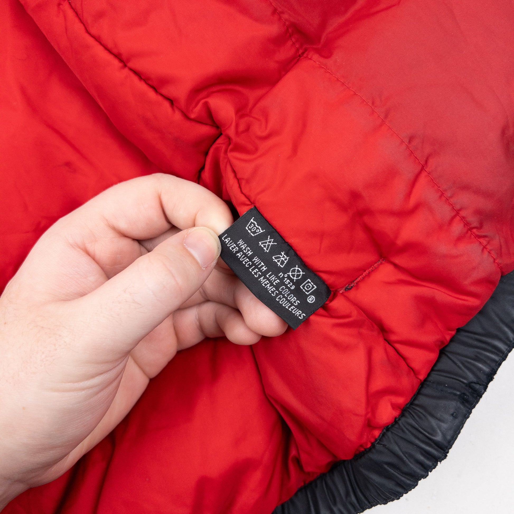 • Other info: Black colour, red contrast colour lining, padded puffer coat style, embroidered flag logo detail, minor general wear as seen