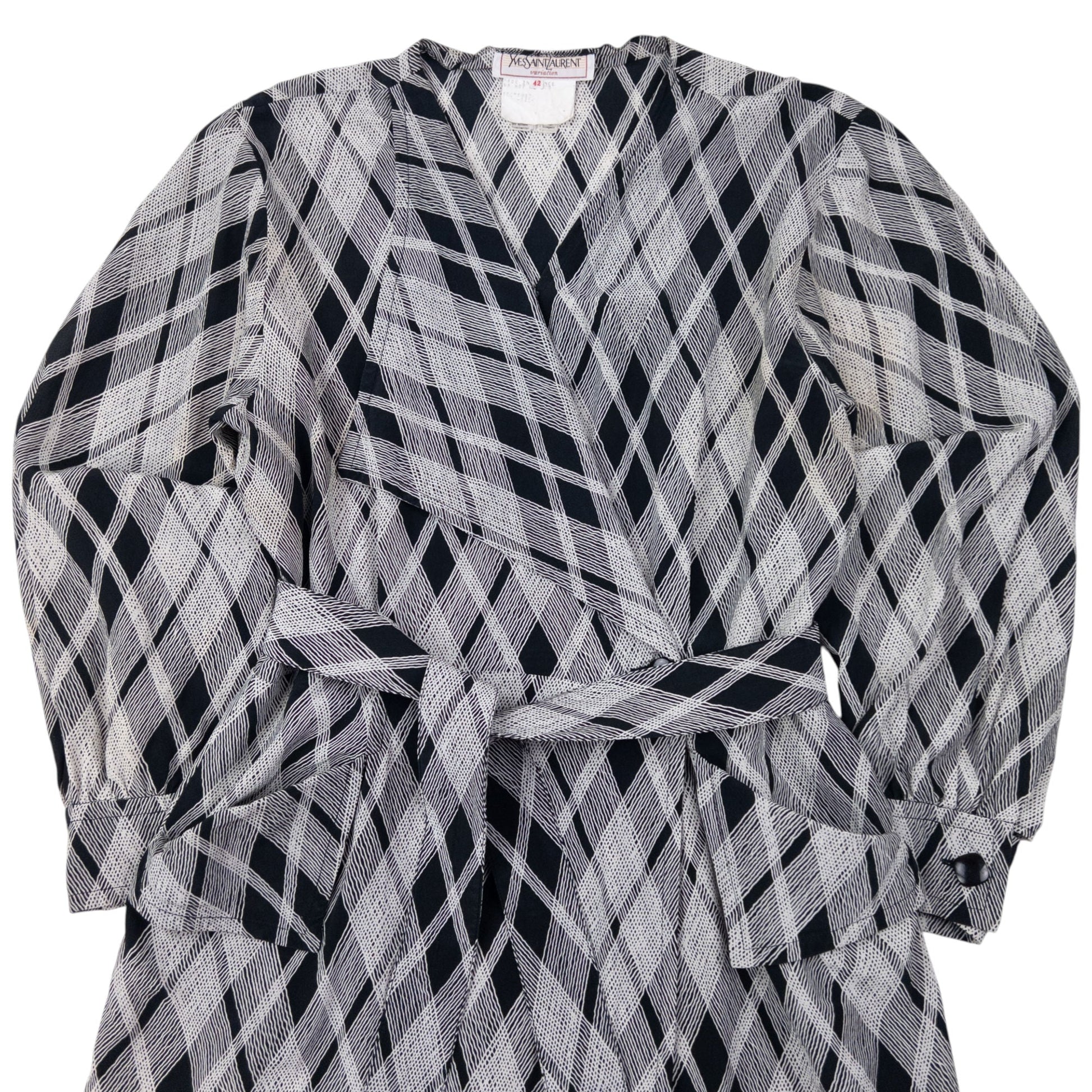 • Other info: Black colour, white contrast colour pattern, lightweight feel, tie-belt accessory, some minor marks as shown