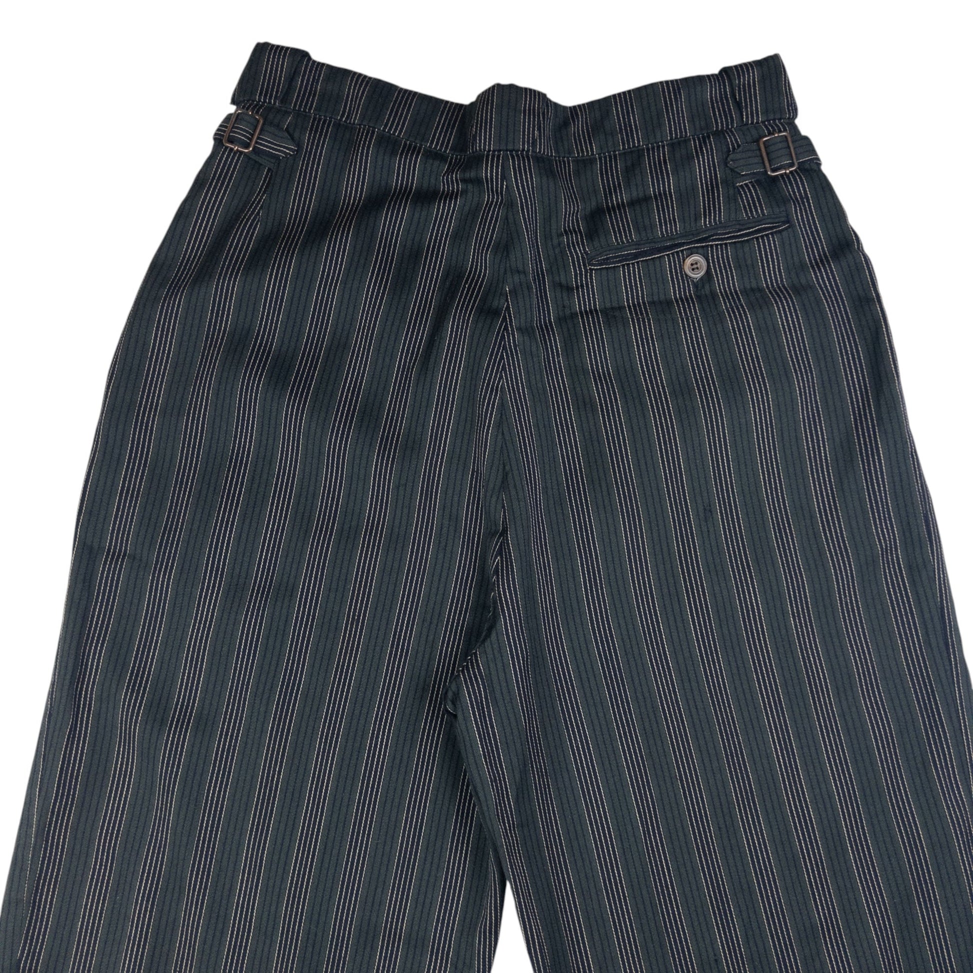 • Other info: Grey colour, navy stripe pattern, pleated waist, high-waist/drop-crotch design, minor general wear as seen