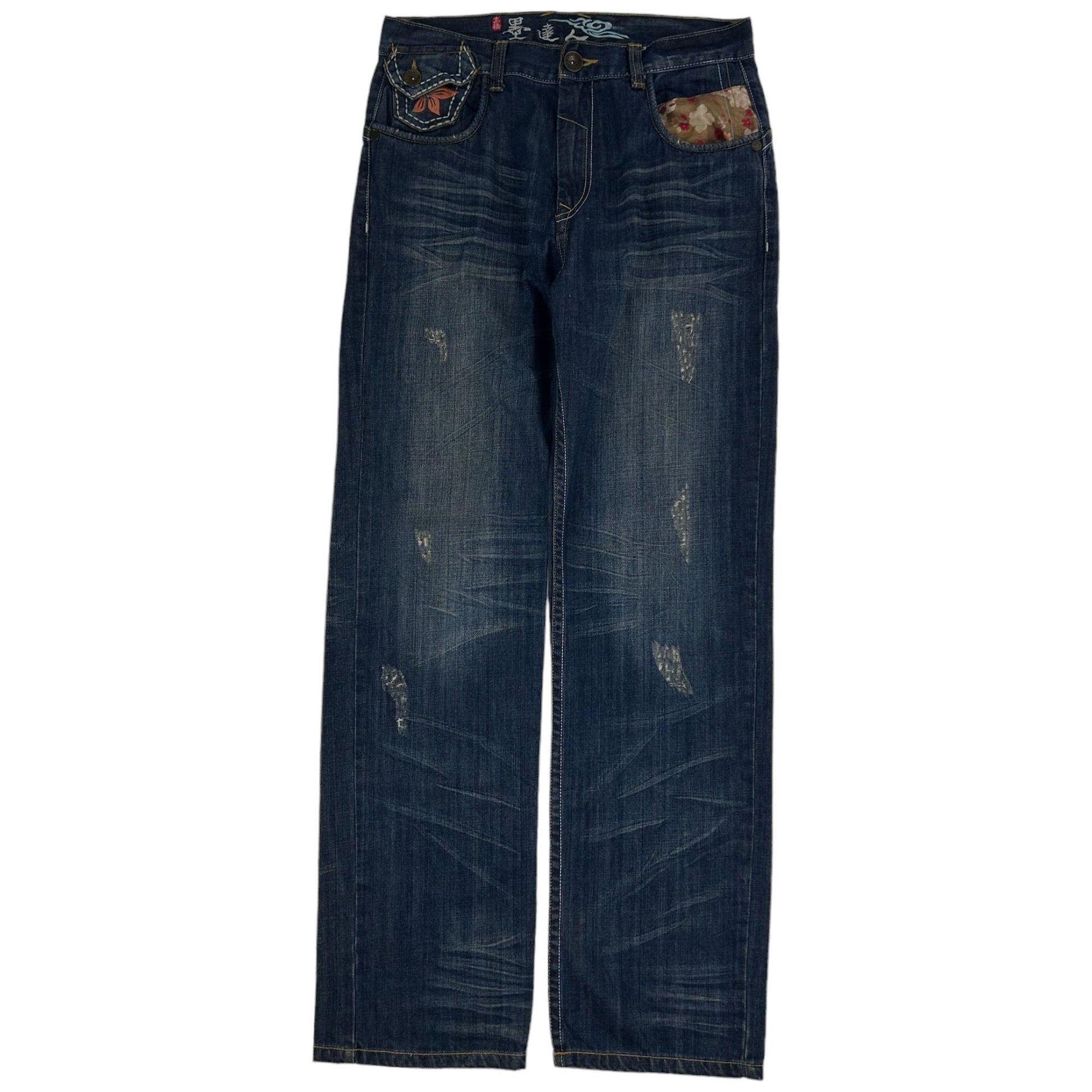 Vintage Flower Big Train Japanese Embroidered Distressed Denim Jeans Size W32