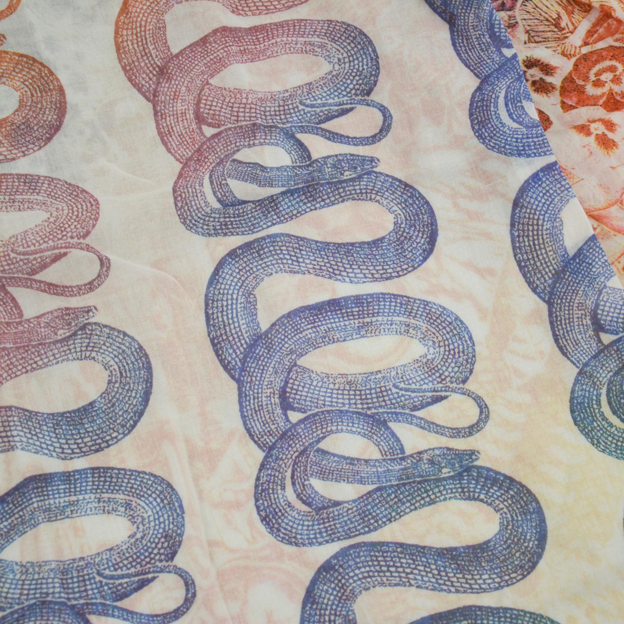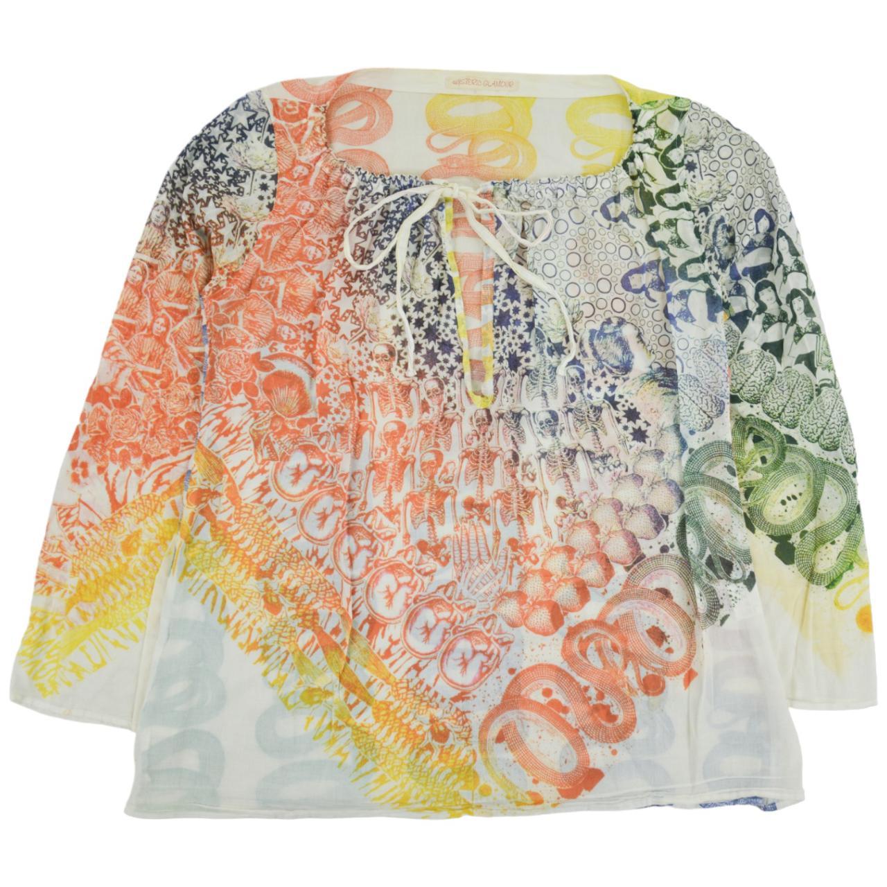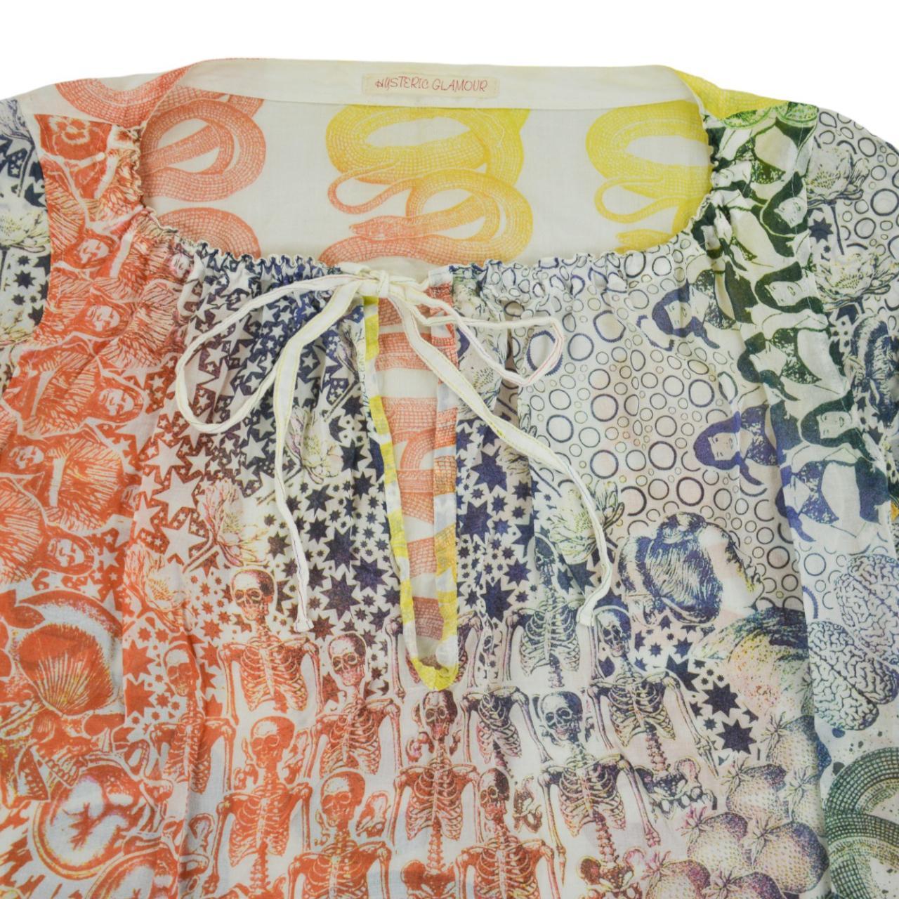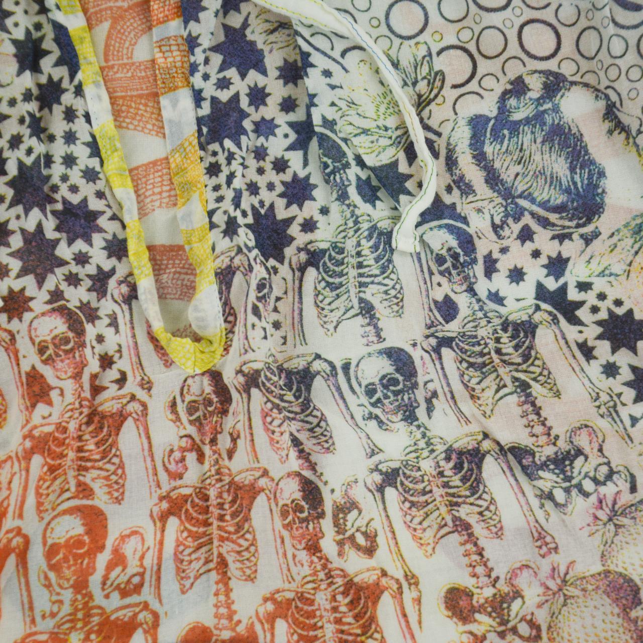Description: Good Condition, front tie long sleeve thin summer top with all over coloured print featuring skeletons snakes and more