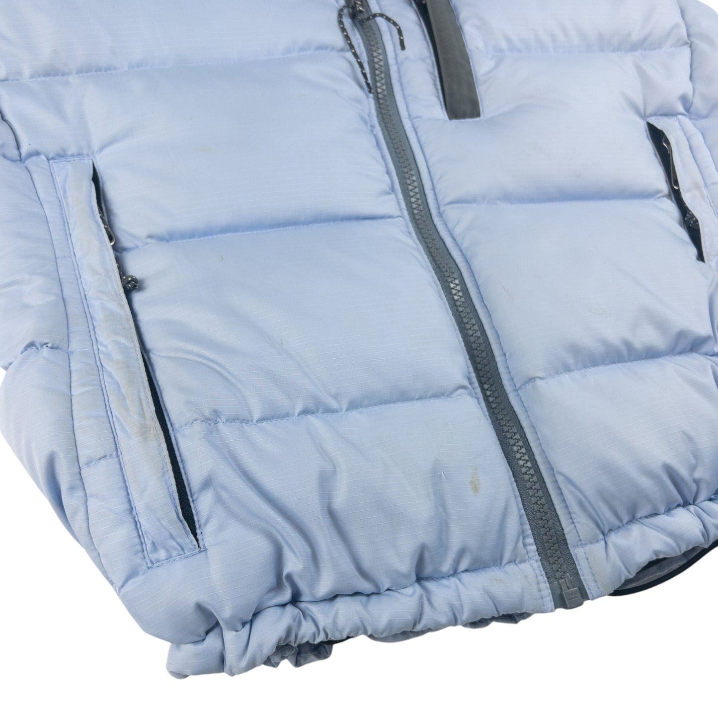 • Other info: Blue colour, grey accent colour, padded puffer jacket vest style, embroidered logos, embossed fastenings, adjustable elastic waist and hem features, some marks and signs of wear as shown