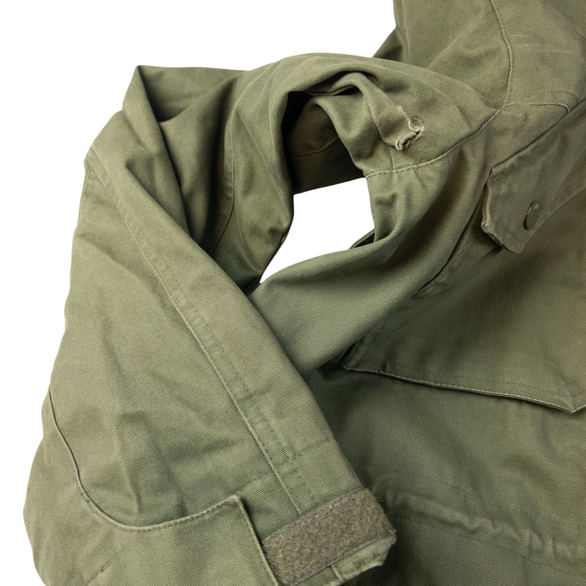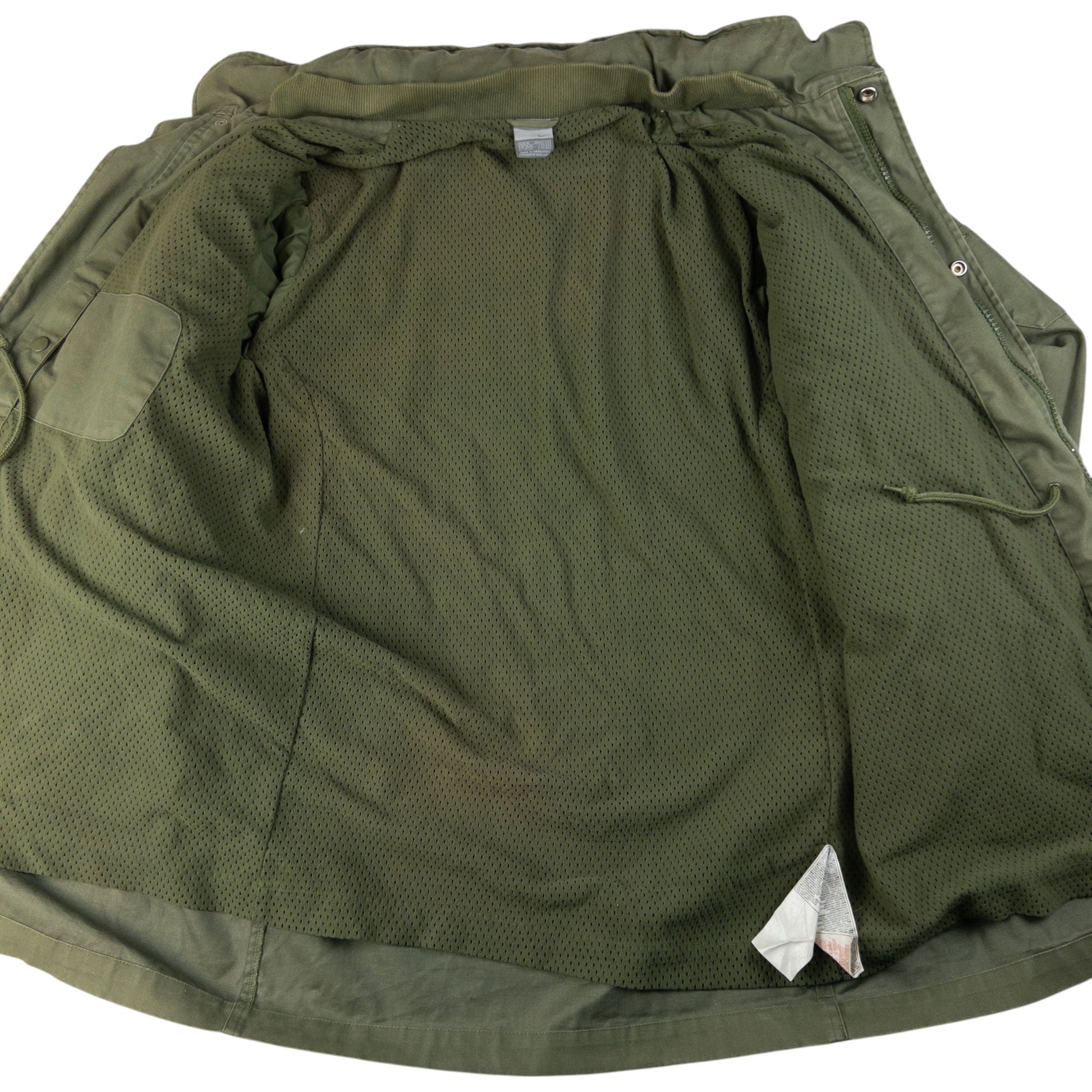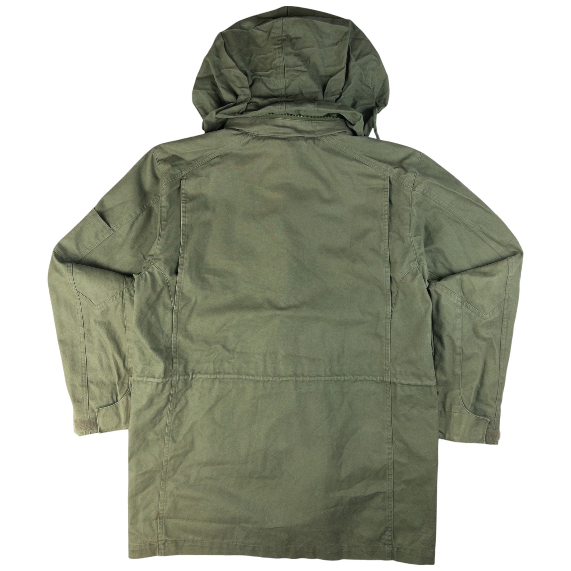 • Other info: Green colour, embroidered logo, military style jacket, hidden hood collar, drawstring hood and waist adjustment, small tear as seen, some warped snap-buttons as shown