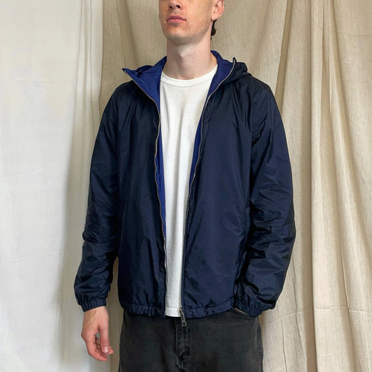 Fornecedor:ajpg_shopPrada Sport 2014 Navy & Iridescent Blue Reversible Resin-Coated Nylon Hooded Windbreaker Jacket