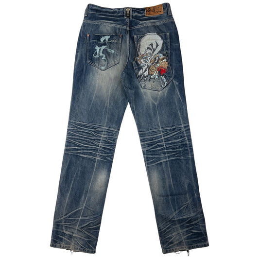 Vintage Jizo Bosatsu Embroidered Koi Fish Troll Japanese Denim Jeans Size W31