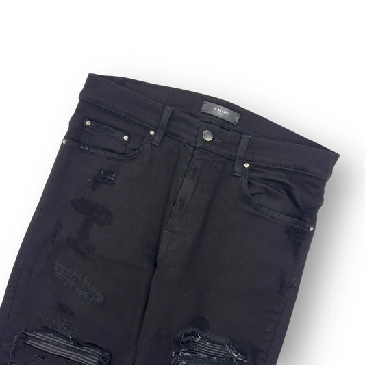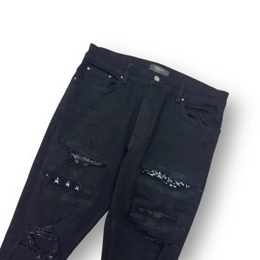 AMIRI MX1 SKINNY FIT LEATHER PATCH DENIM JEANS BLACK W32