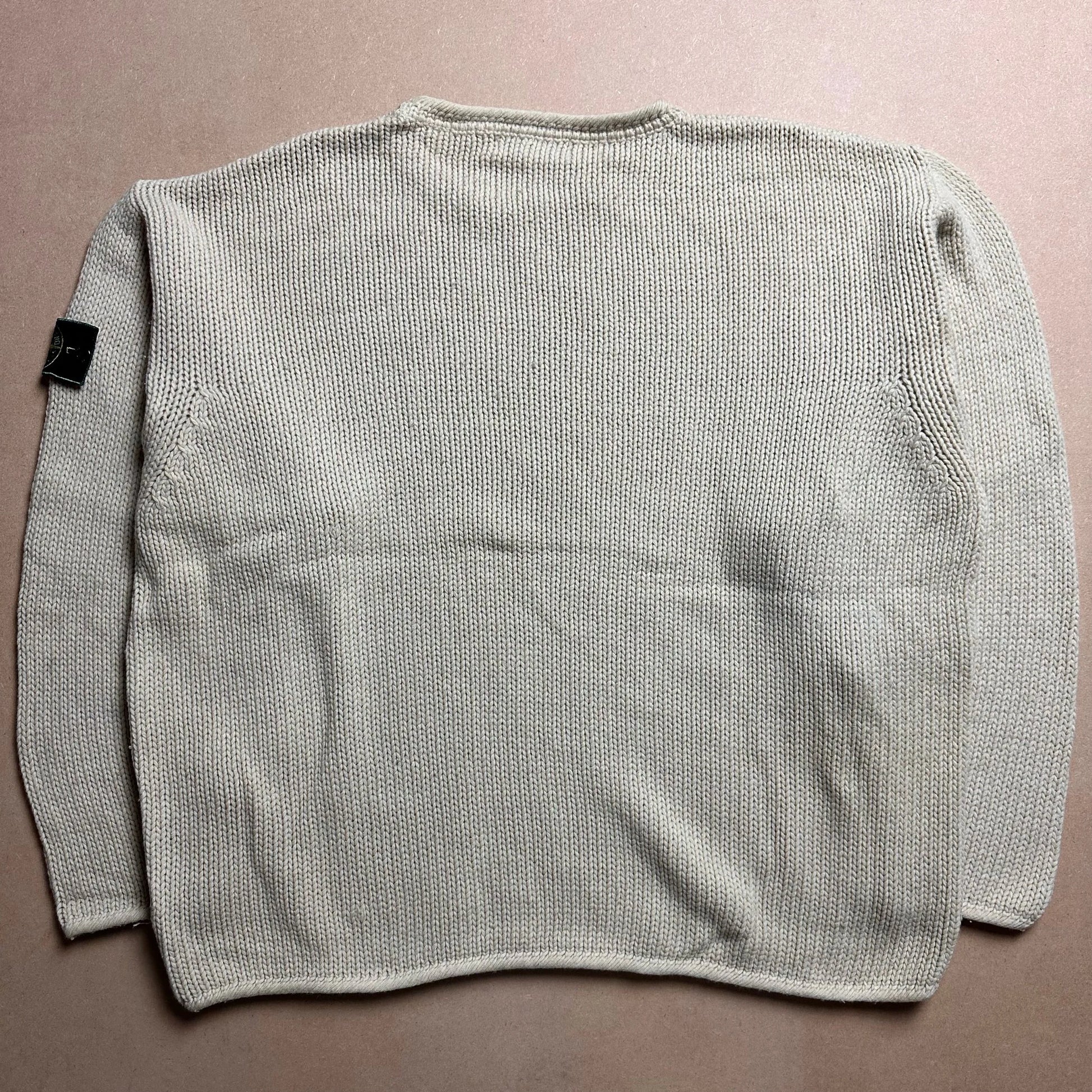 Designed by Massimo Osti. Cotton wool blend with a hand woven knit pattern. Crew one m style with a closed seam finish. Rounded cuff and hem. Complete with a shoulder piece badge.