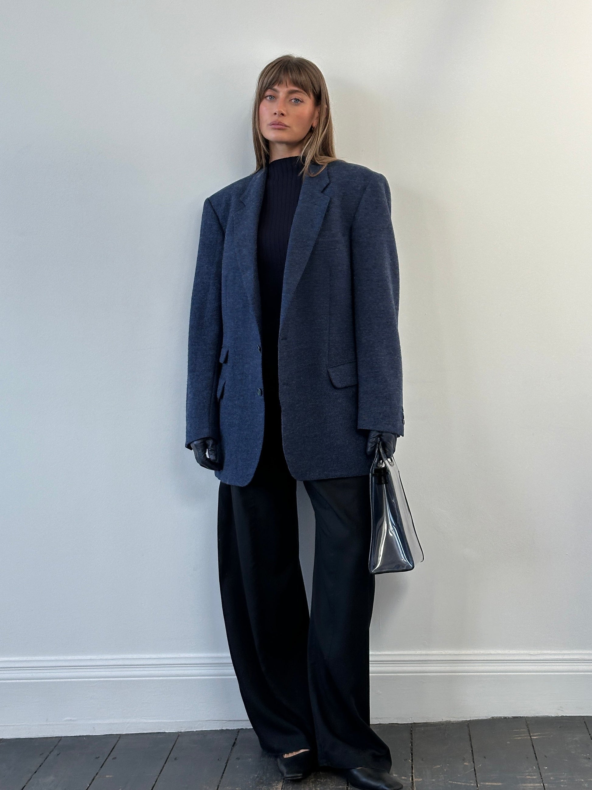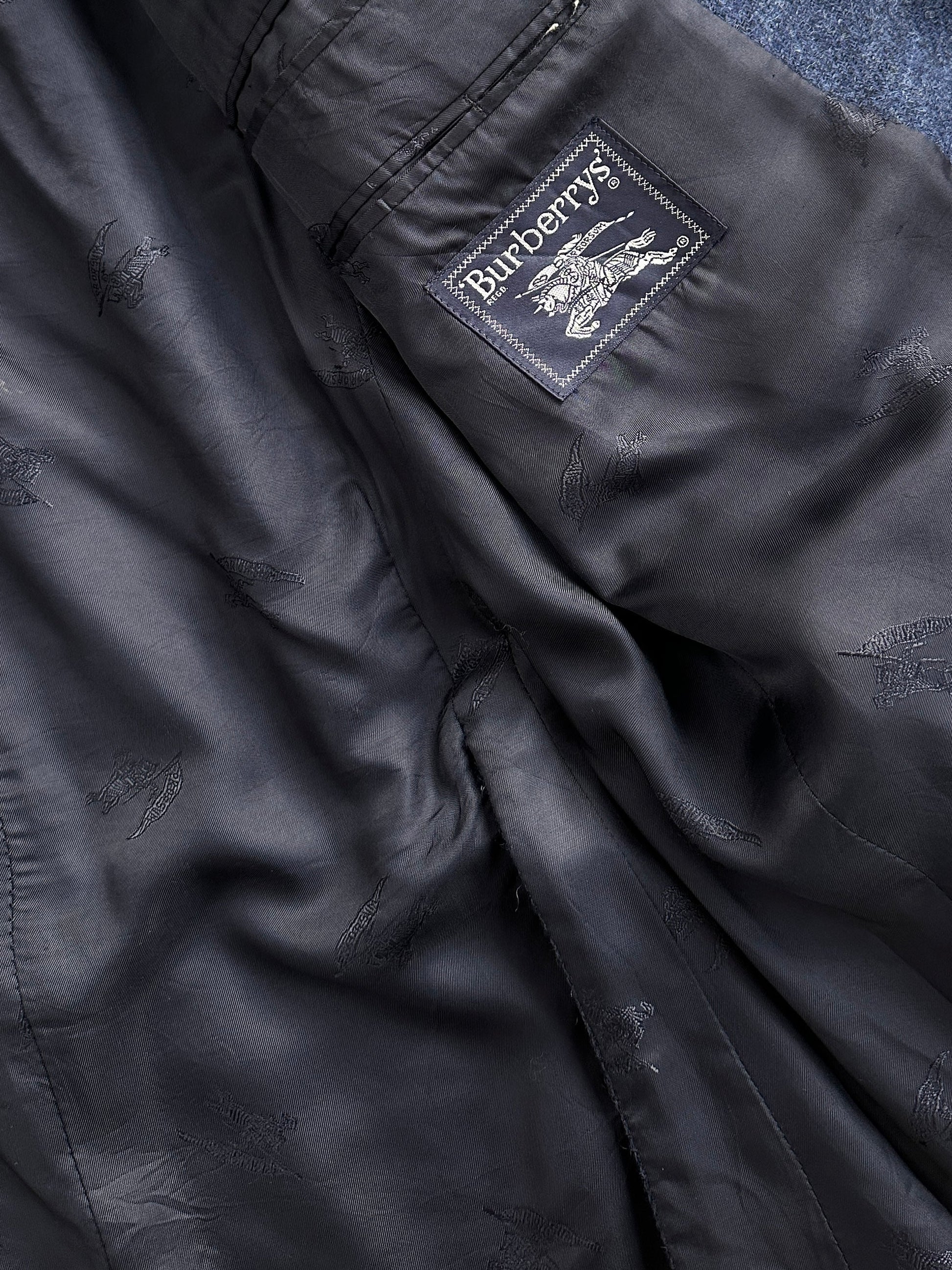 Burberrys 1990s pure brushed blue wool single breasted blazer with a soft textured finish and subtle structure. Finished with full Burberrys monogram lining.