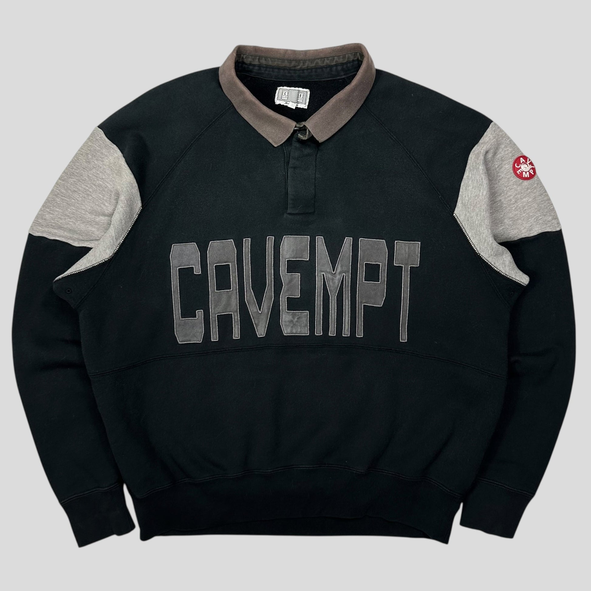 Cav Empt spellout rugby polo collared sweatshirt, embroidered logo to front, sleeve logo, screen print on the back, as famously worn by Skepta.