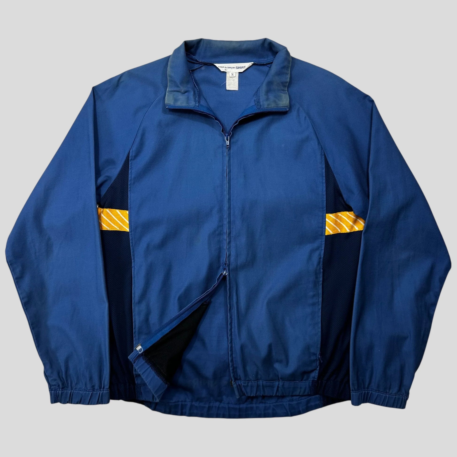 Very rare early 2000’s Made in Japan Comme Des Garçons blue cotton panelled track jacket, stretchy mesh sport panelling down each side with yellow textured detailing, spellout reflective logo across the lower back, stunning cut and quality.
