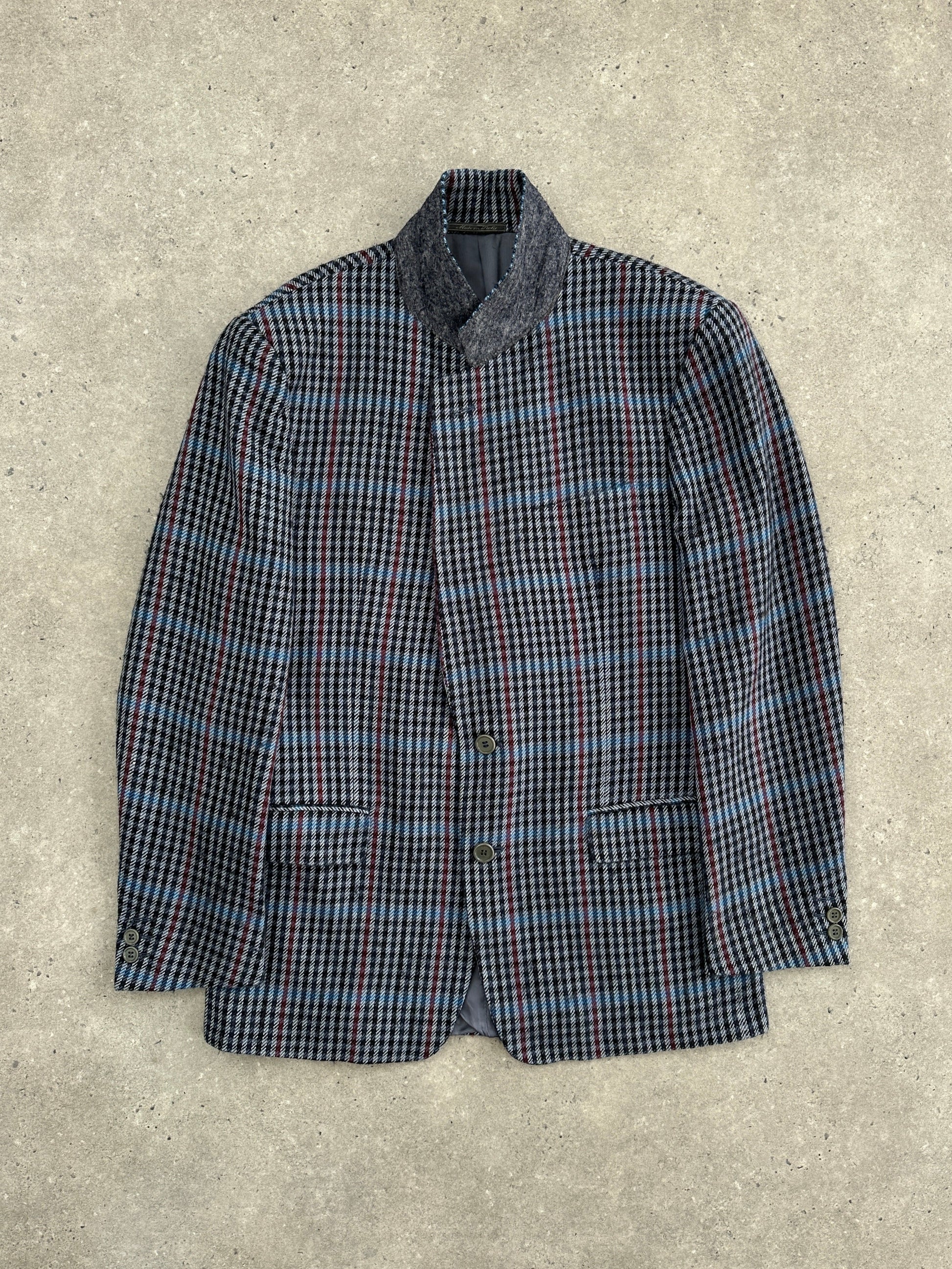 Late 1980s Dior Monsieur blazer, cut in brushed virgin wool with a bold houndstooth check red and blue overplaid. Tailored in Italy for Italian craftsmanship.
