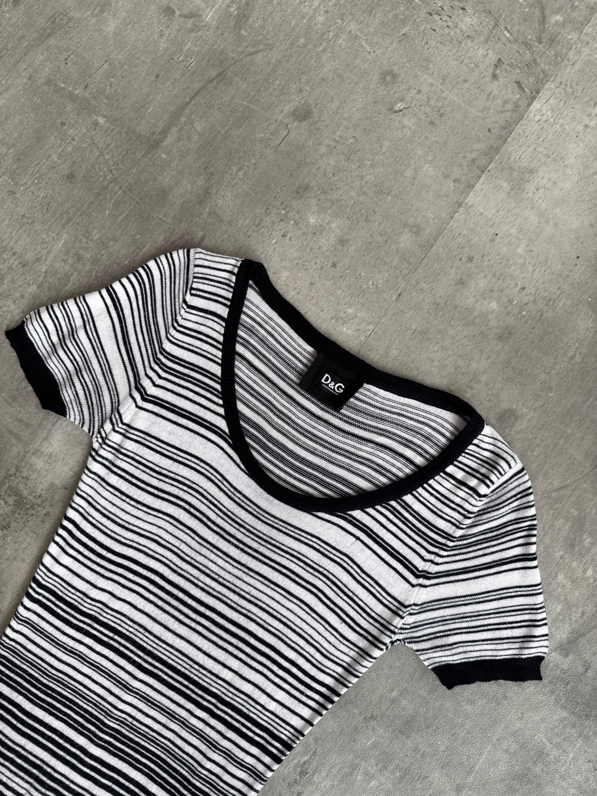 This D&G striped low cut maxi dress delivers signature early 2000s sensuality with a figure-skimming silhouette and bold detailing. Featuring a plunging neckline, ruched hem, and body-hugging construction, the piece balances coastal charm with high-impact glamour. The vertical stripe pattern elongates the frame, while the gathered hem adds movement and a flirty, deconstructed twist. Perfect for summer evenings or elevated resort styling, this dress channels the sultry confidence of vintage D&G at its finest—unapologetic, dramatic, and unmistakably Italian.