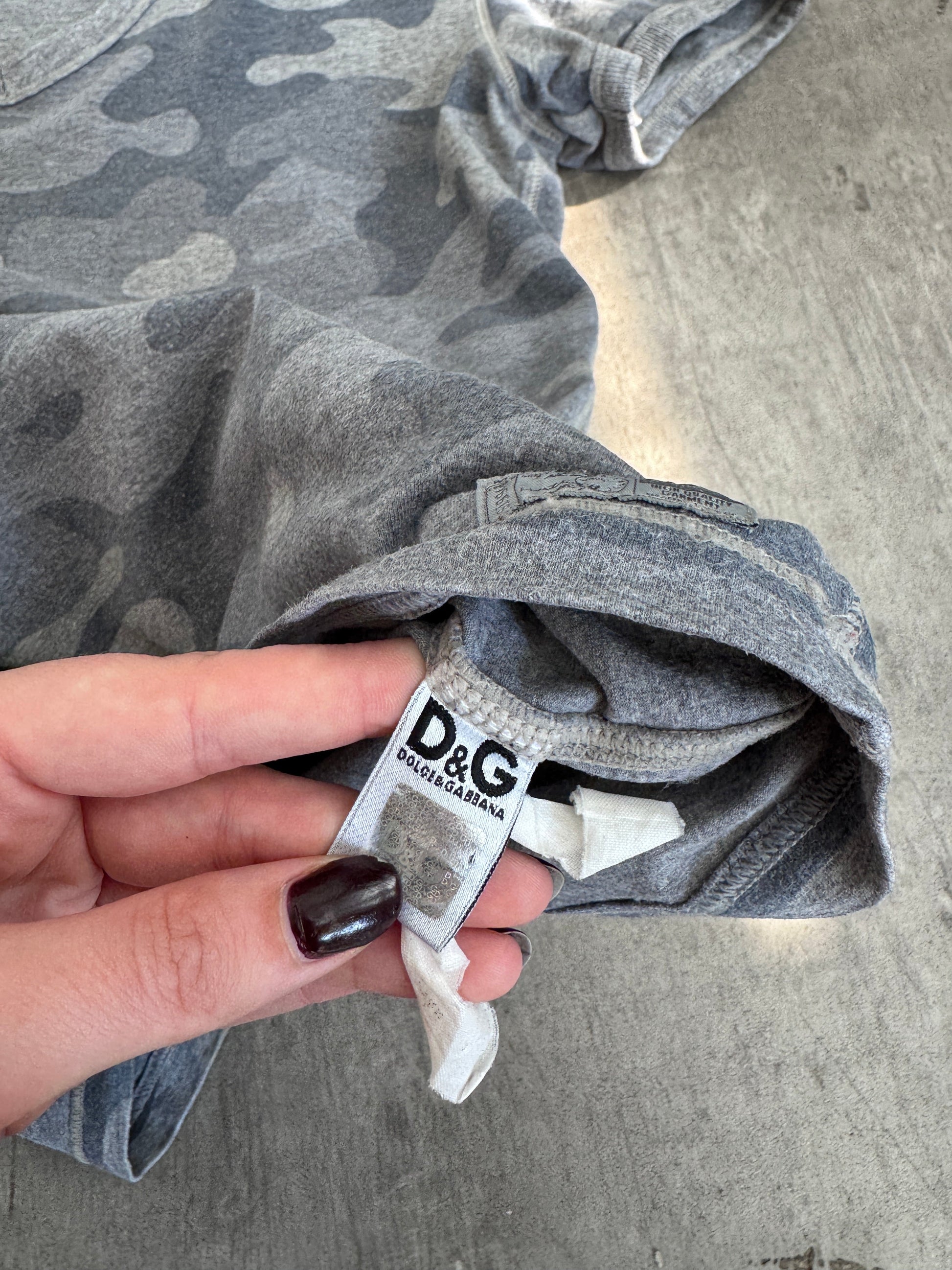 A distinctive Dolce & Gabbana V-neck tee featuring a subtle grey camouflage pattern, combining casual wear with the brand’s signature edge. This piece reflects D&G’s early 2000s aesthetic, blending bold graphics with wearable everyday silhouettes.
