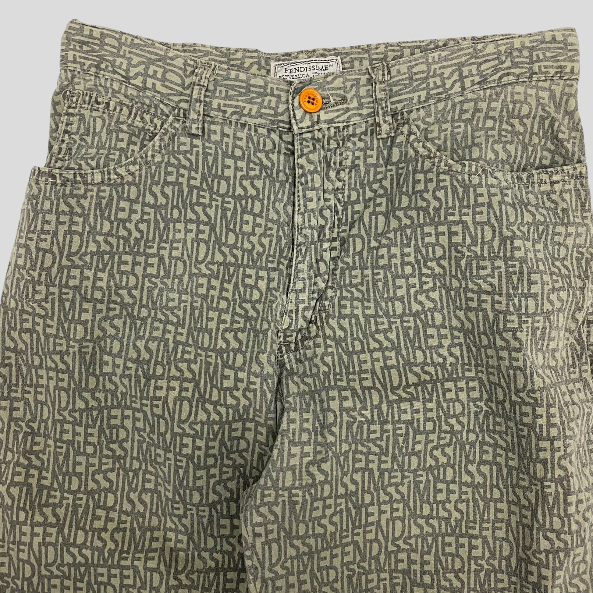 These trousers have an all over Fendissime monogram in a grey and washed green finished with a contrasting orange button and Fendissime tag to the seat.