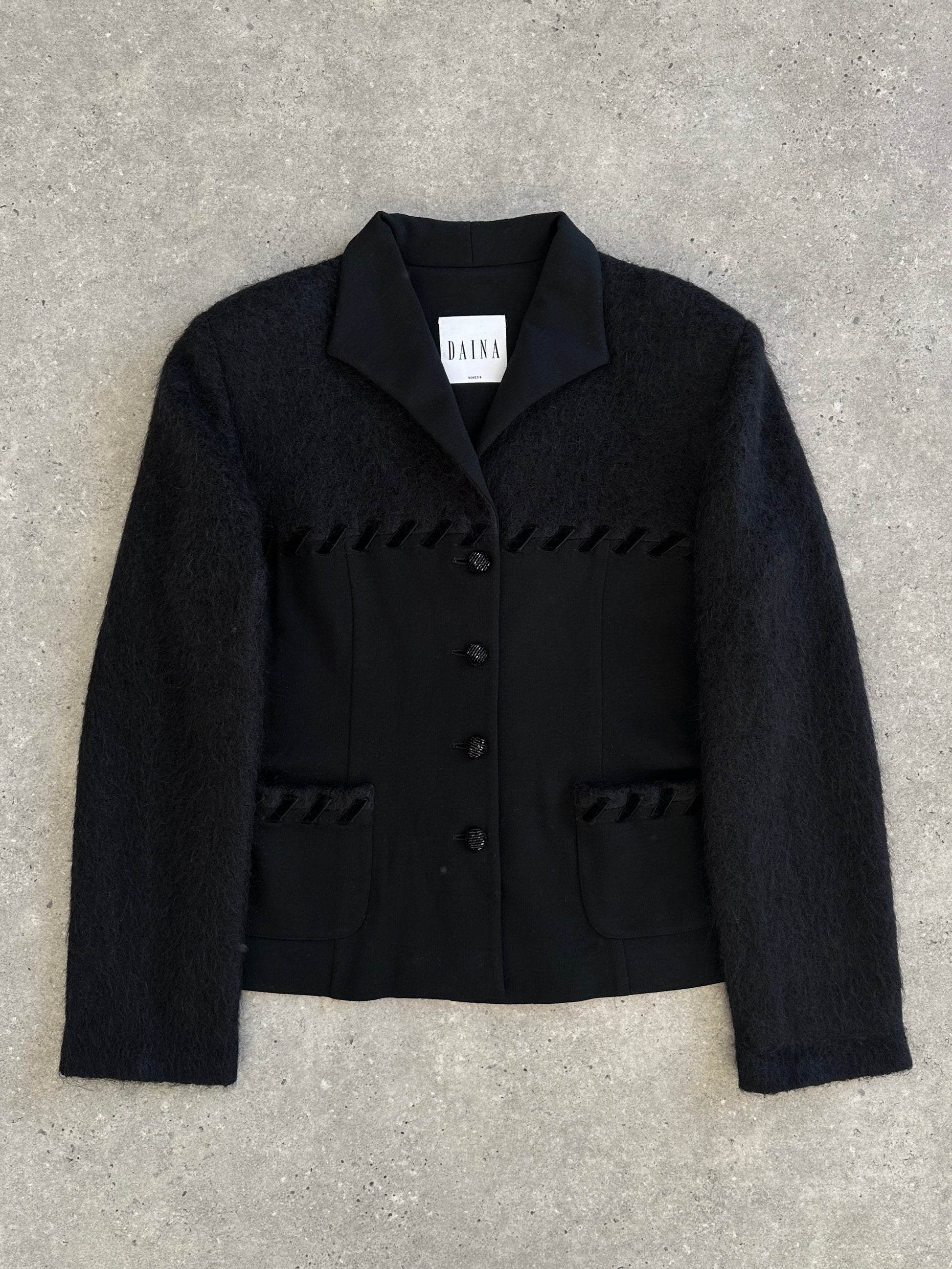 Italian vintage 1990s tailored wool jacket by Daina Venezia, featuring a soft brushed mohair-wool upper with smooth structured lower panels and braided trim detailing. A refined piece balancing textural contrast and elegant tailoring.