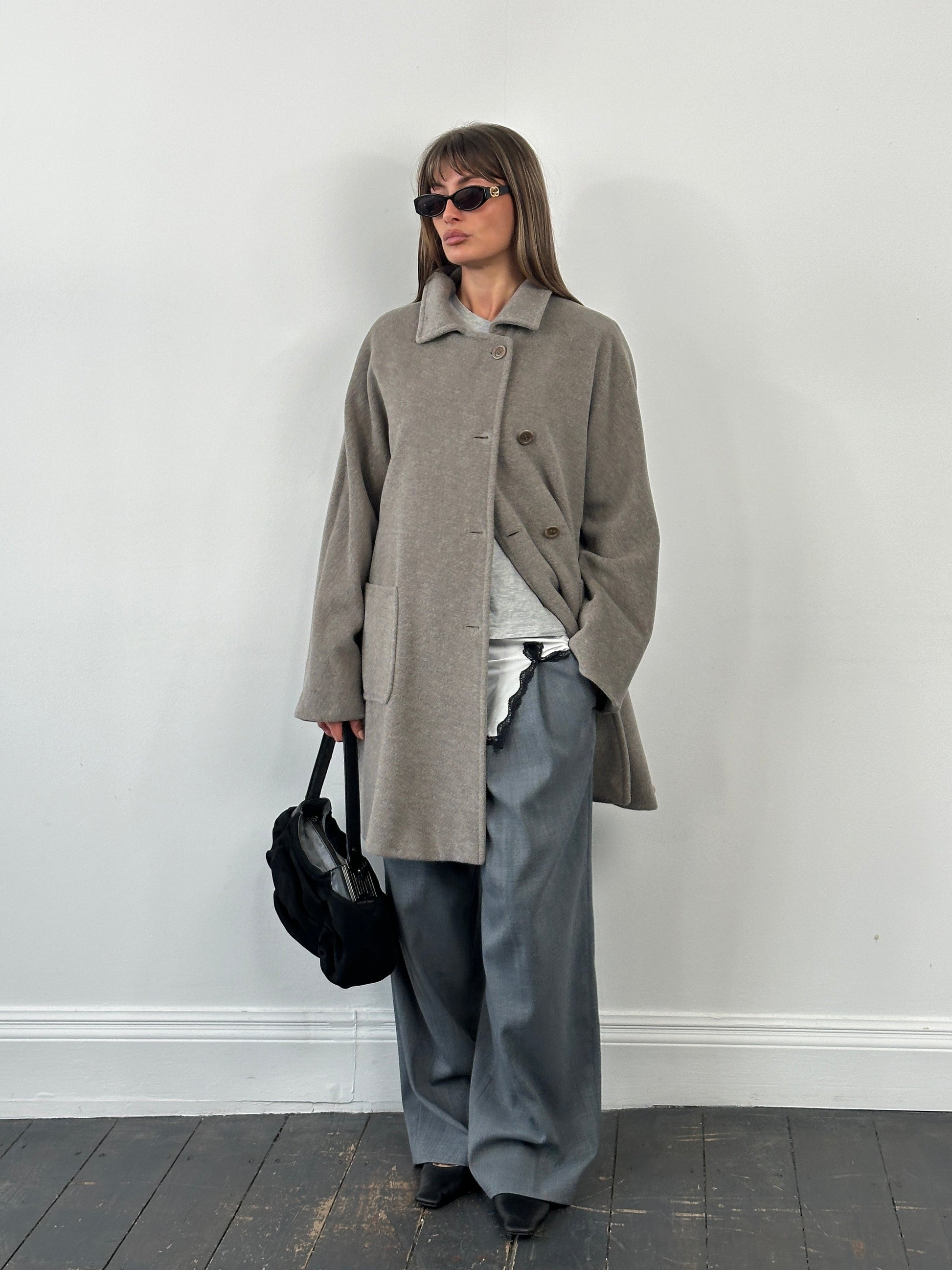 Vintage Marella by Max Mara single breasted coat with a clean tailored silhouette and removable faux fur collar. Designed with a classic straight cut and practical front pockets, finished in a soft taupe tone typical of refined Italian outerwear from the 1990s.