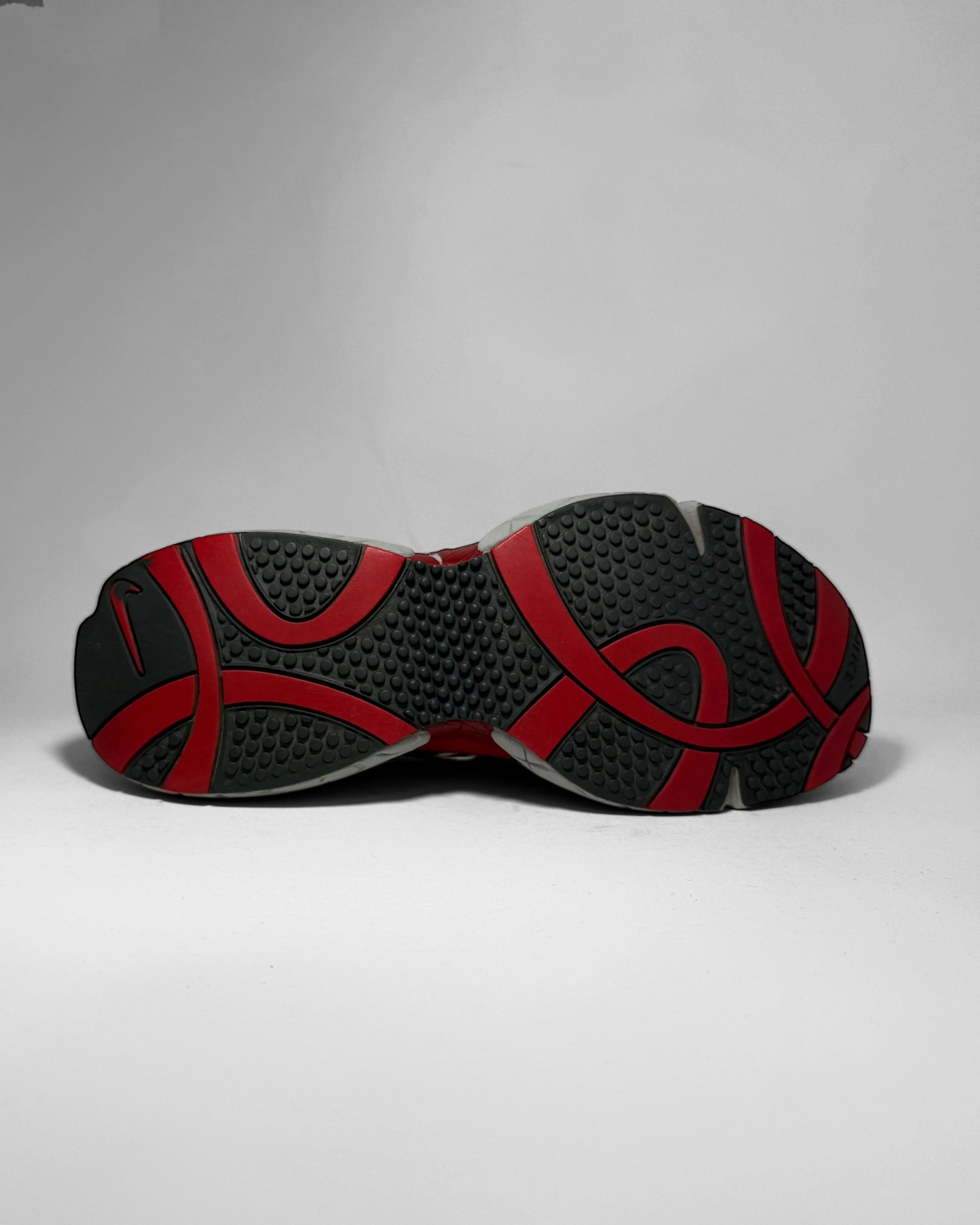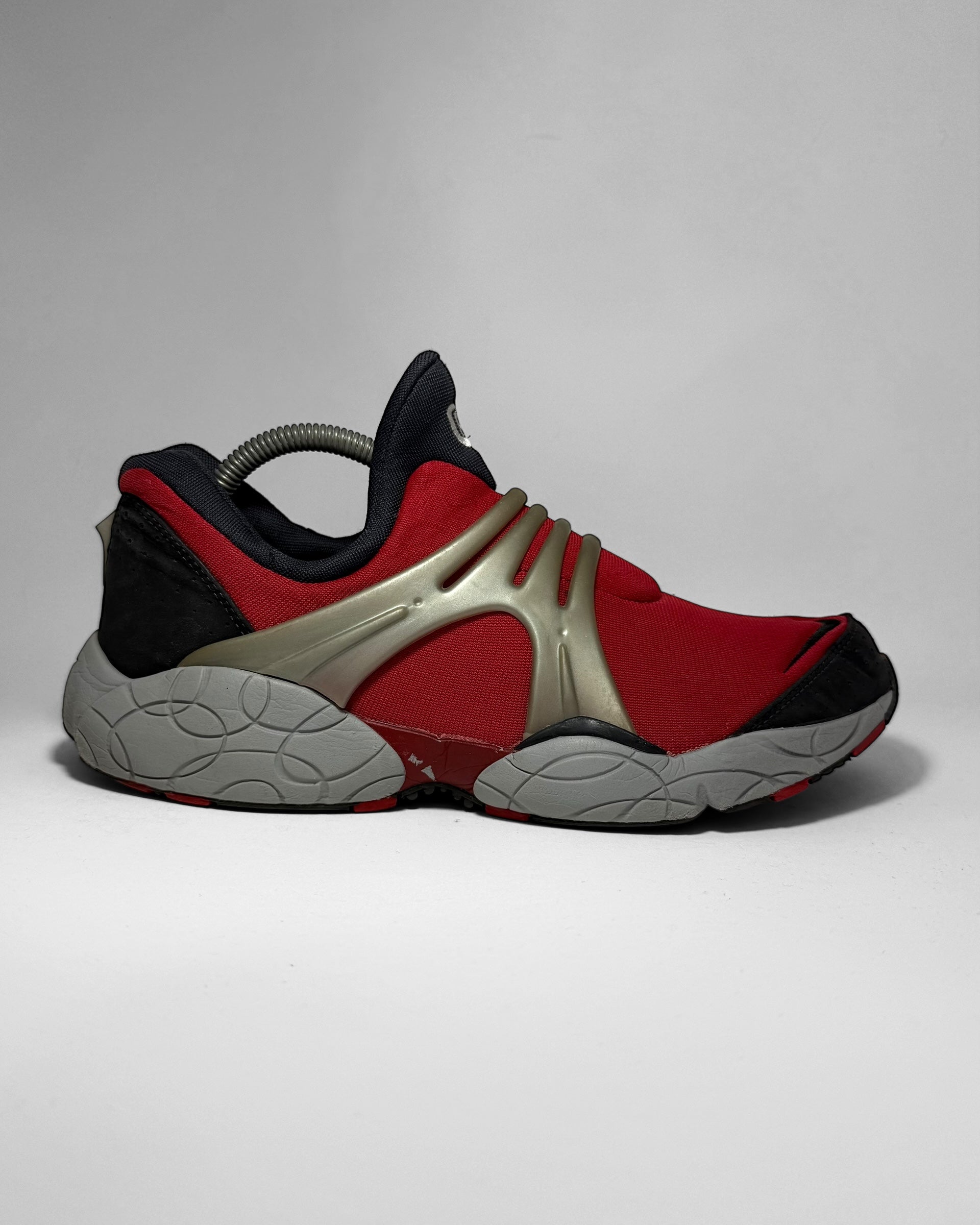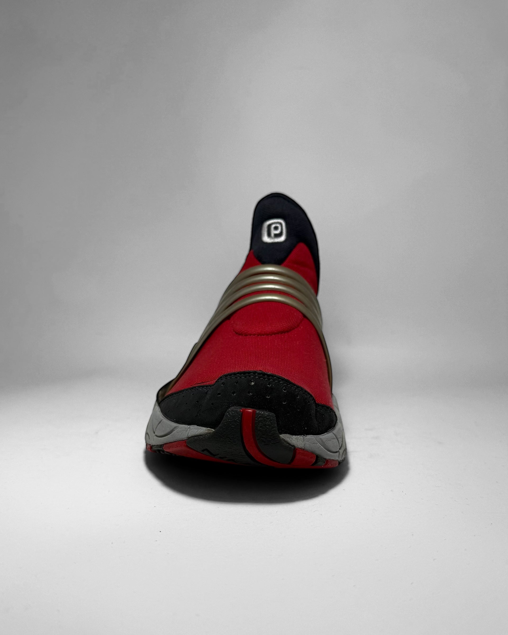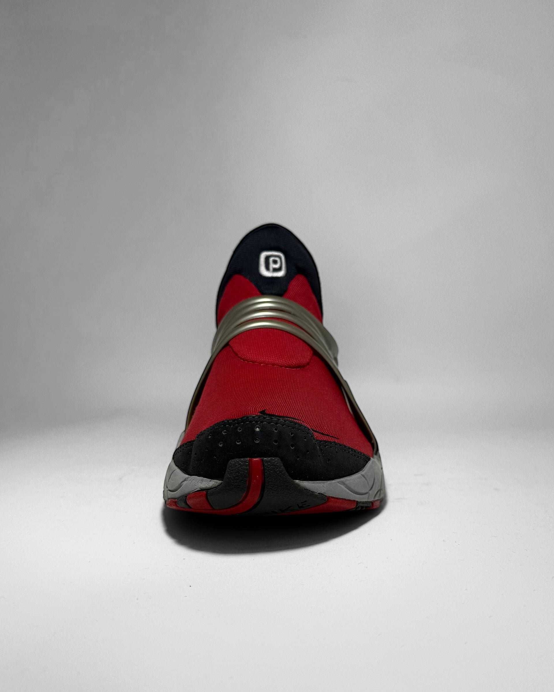 Slip-on with a red neoprene upper, black mesh collar, and suede heel wrap. Features a molded beige midfoot cage for structure and support. Sits on a chunky, textured foam midsole with a bold tread pattern. Finished with a “P” logo on the tongue and integrated heel loop.