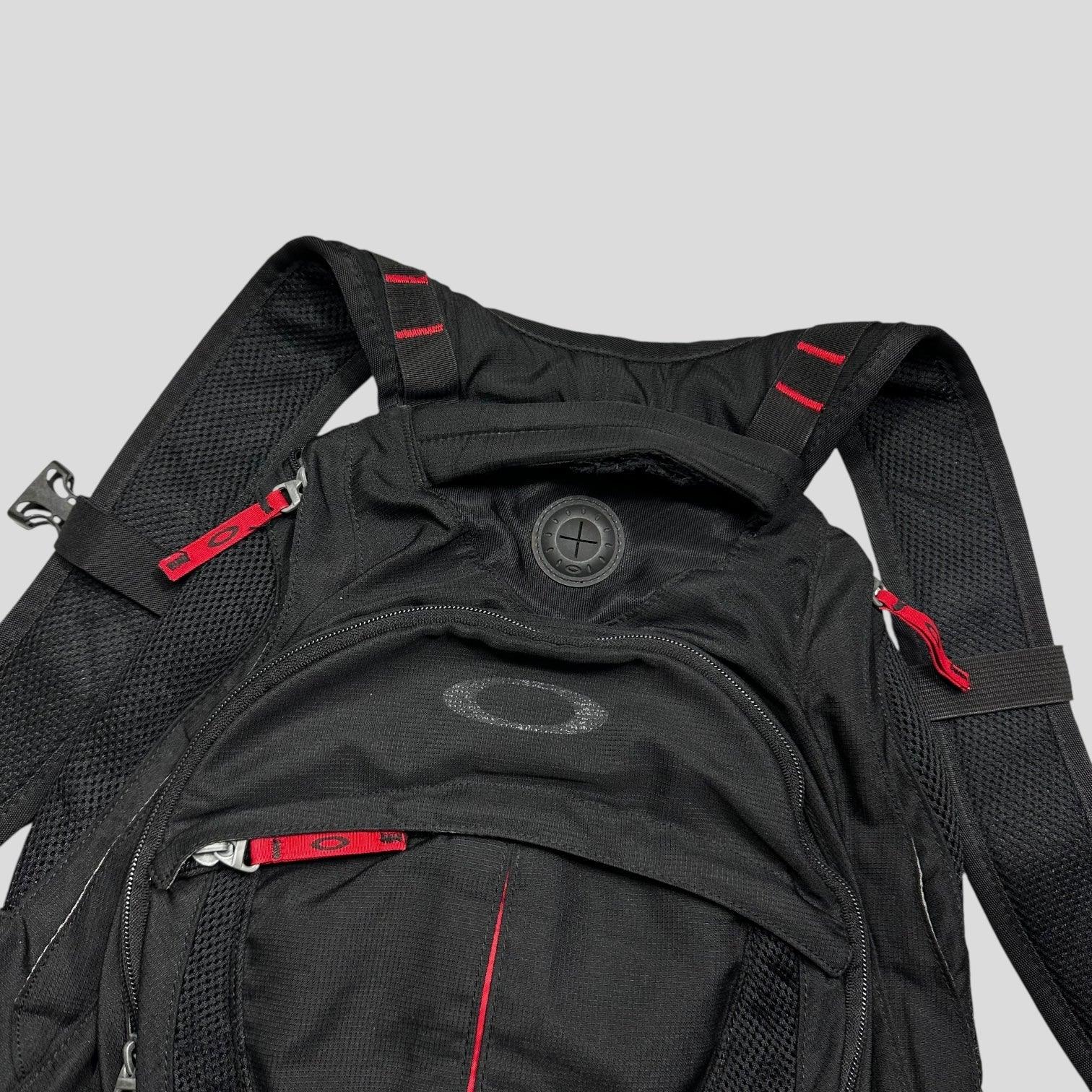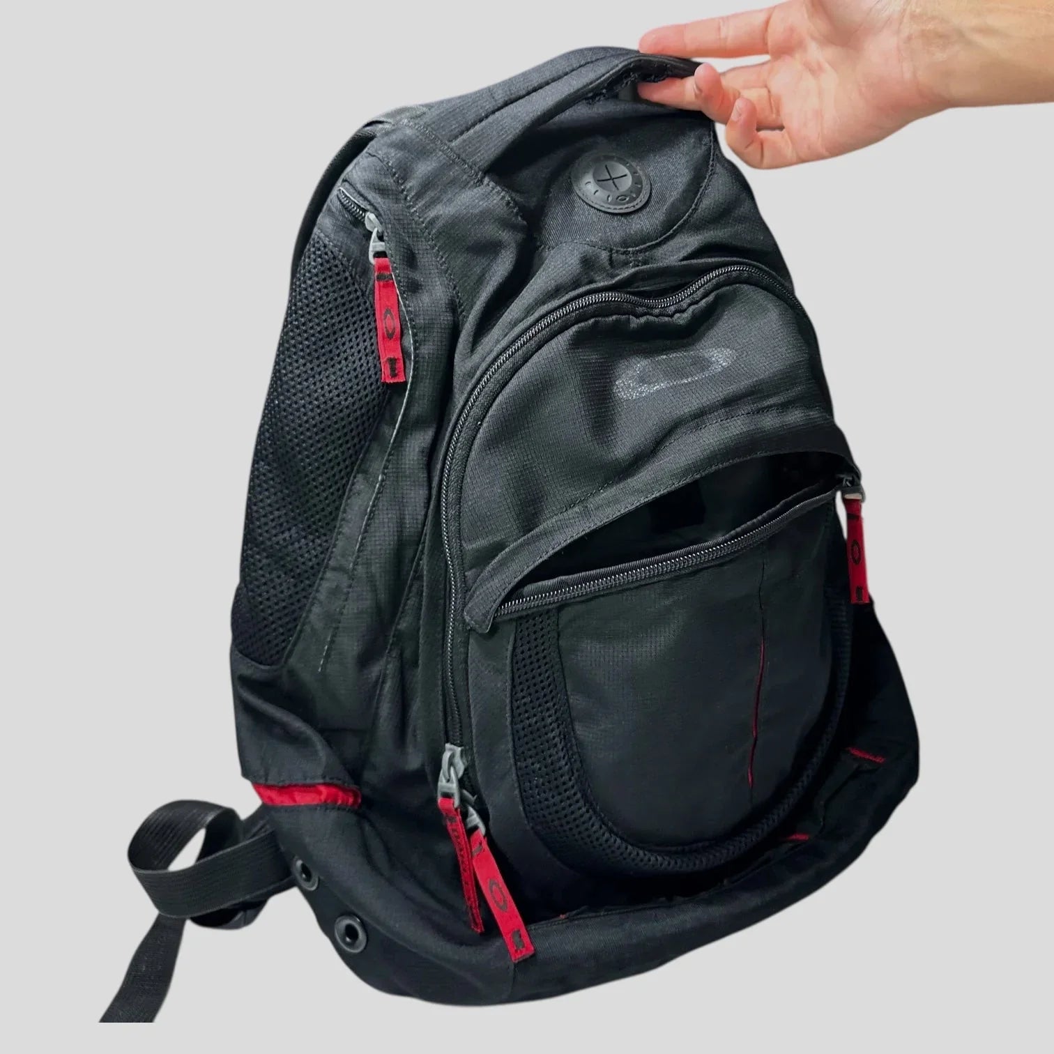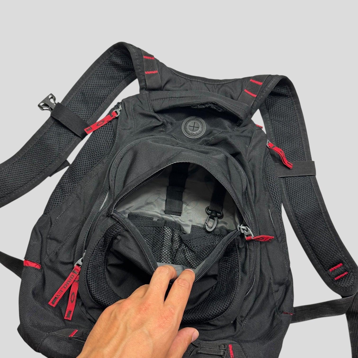 Rare Oakley 2000’s black and red backpack, designed to wear with a Walkman / MP3 player, loads of pockets and zip storage, metal clips and carabiner to attach accessories, Oakley logo’s throughout.