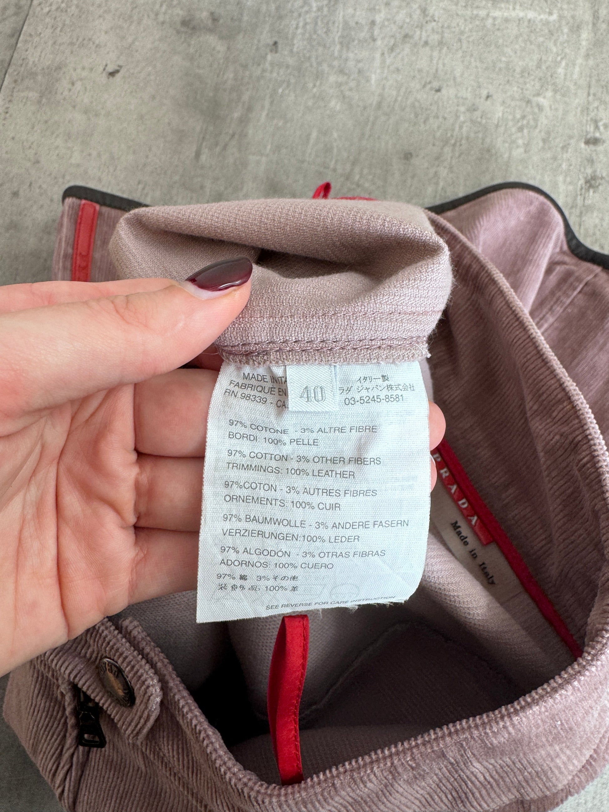 A refined Prada midi skirt crafted from soft corduroy in a muted dusty pink tone, combining subtle texture with a modern, feminine silhouette. This piece reflects Prada’s ability to elevate everyday fabrics through thoughtful design and clean construction.