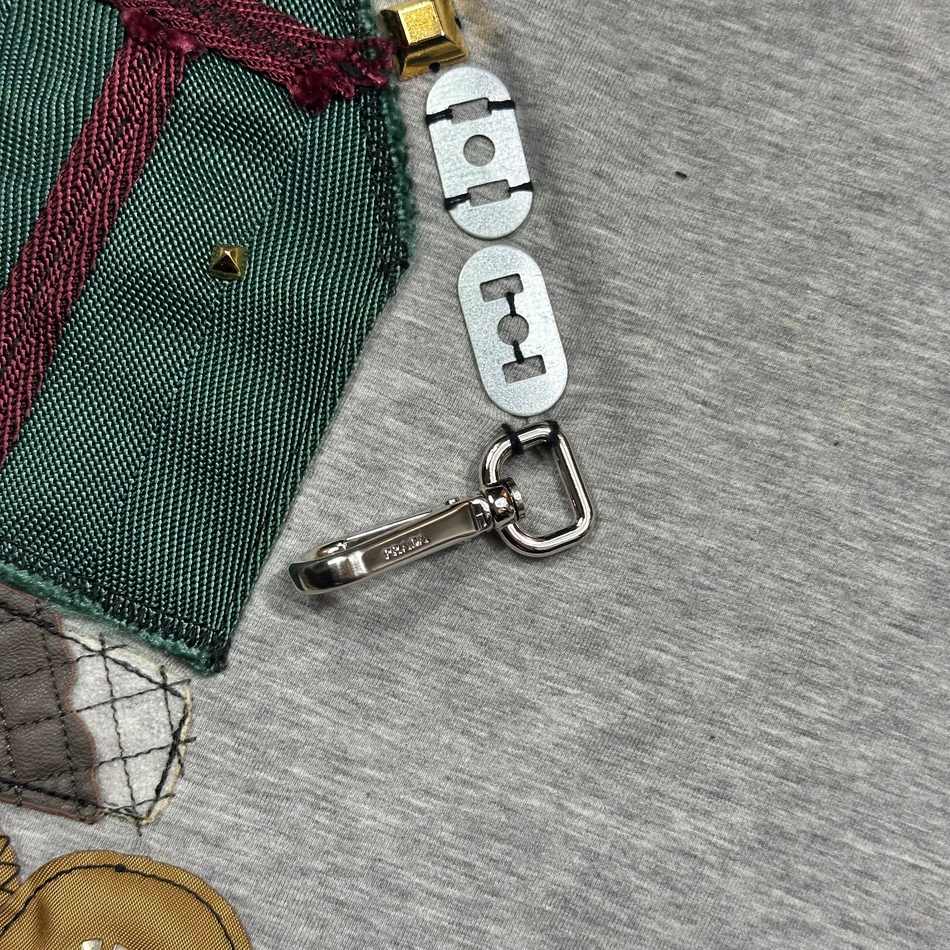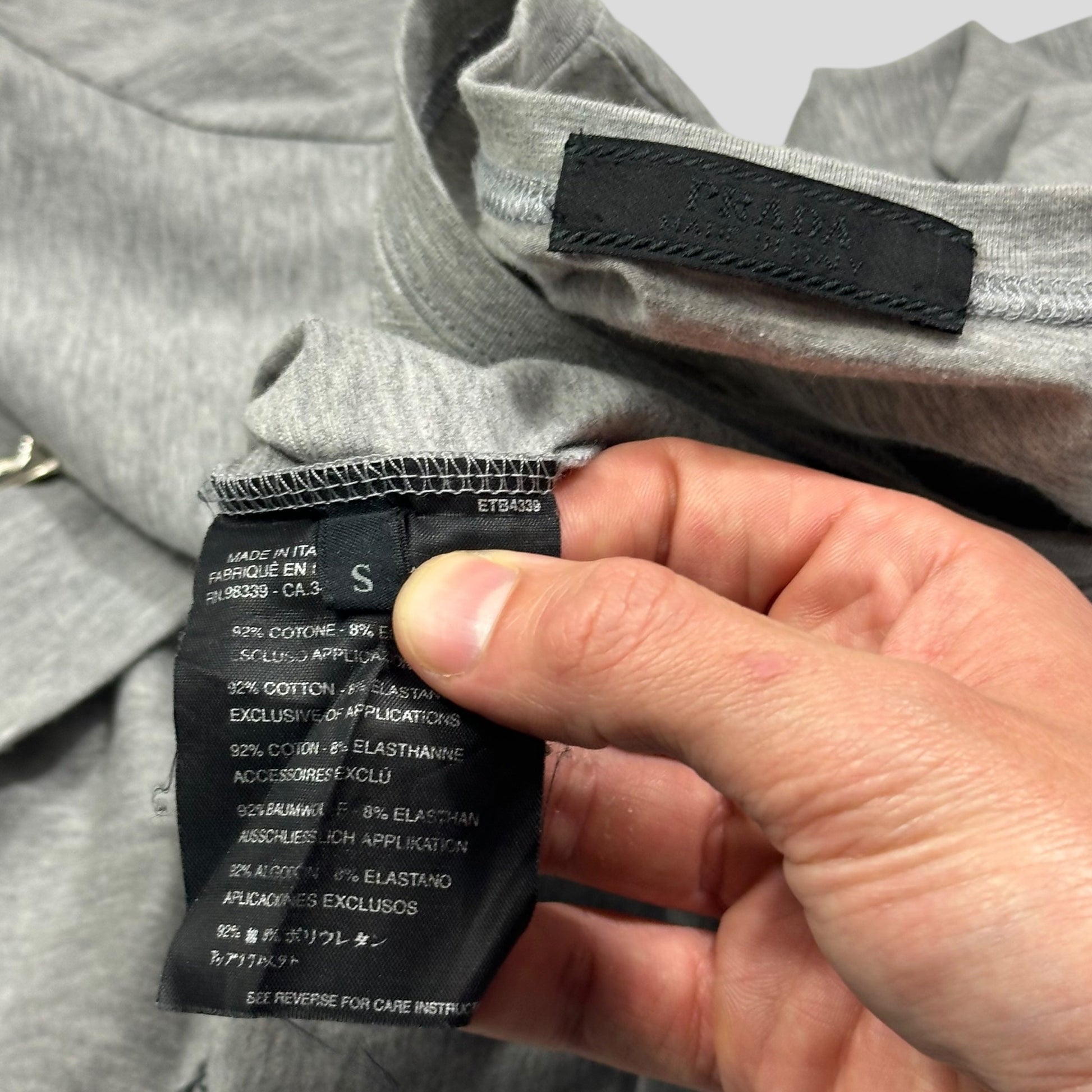 Extremely rare Prada fall winter 2004 grey Robot tee, amazing chic and fun use of Saffiano leather, Prada metal keys and carabiner and other materials on the front finished with the Prada Sport Red logo as the mouth.