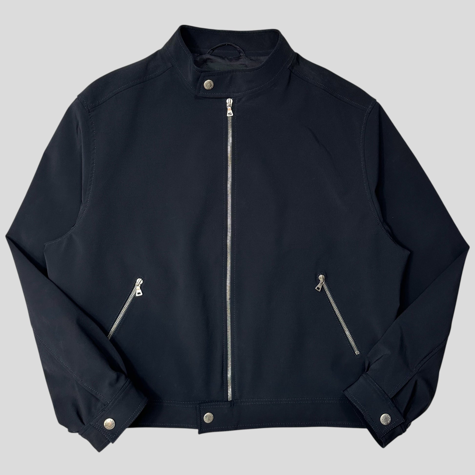Extremely rare and incredibly crafted Prada mainline spring summer 1999 navy blue nylon blouson moto smart jacket, constructed from a nylon rubber mix that’s fairly thick and structured, looks incredible, fit is very boxy with wide arms, metal Prada buttons and RIRI zips, suit style silky lining with inside pockets.