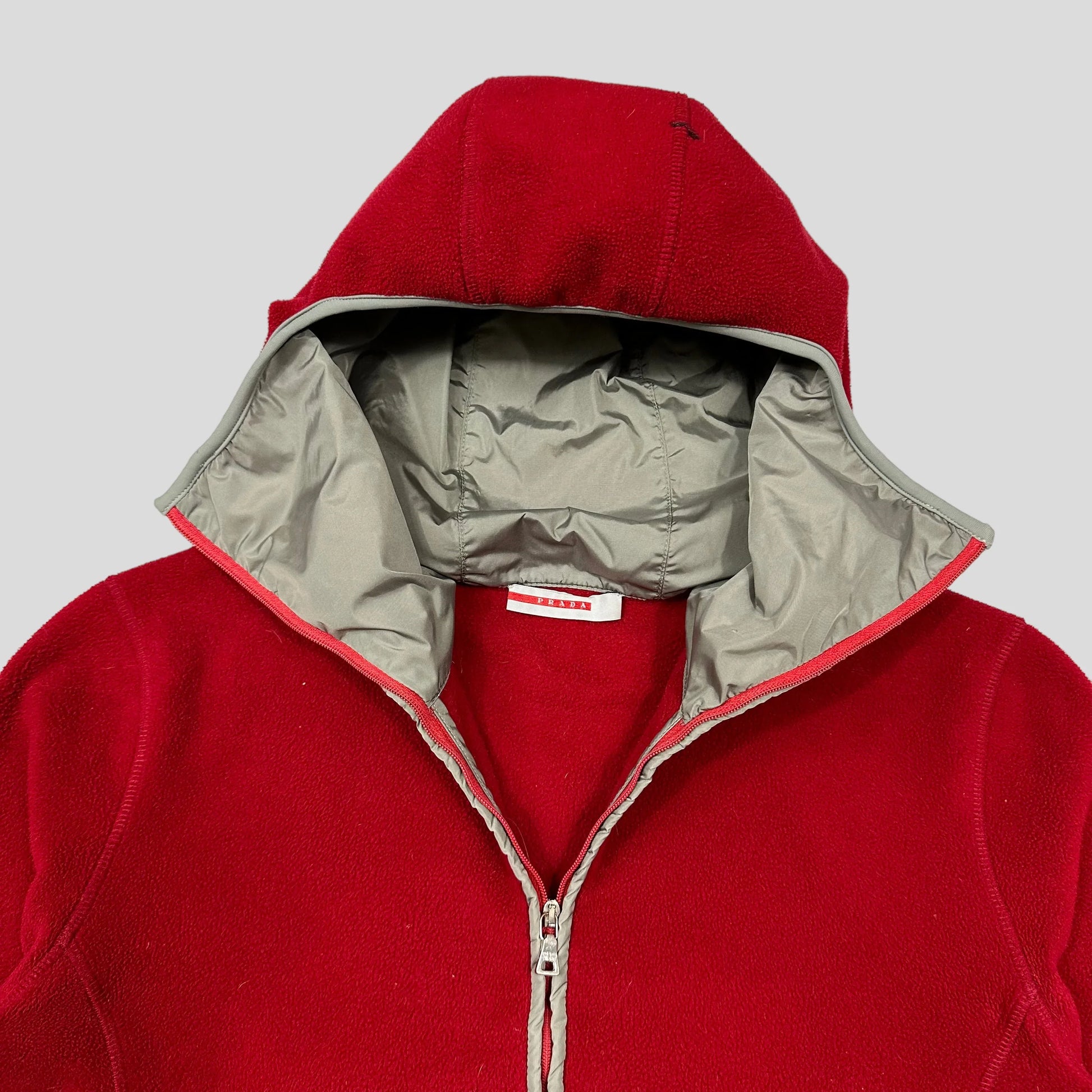 Very rare Prada Sport 2000’s Fleece Balaclava Jacket, Scarlett red zip-up fleece with grey nylon detailing, balaclava face cover hood, prada sport red tab to hip.