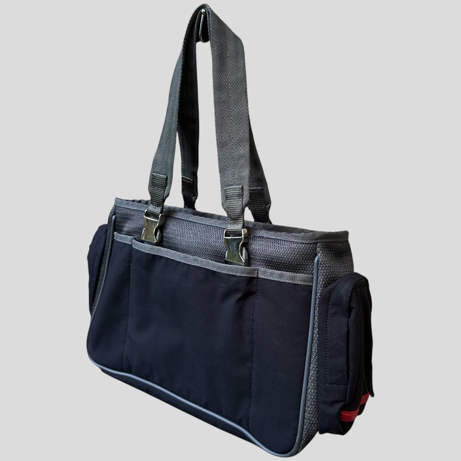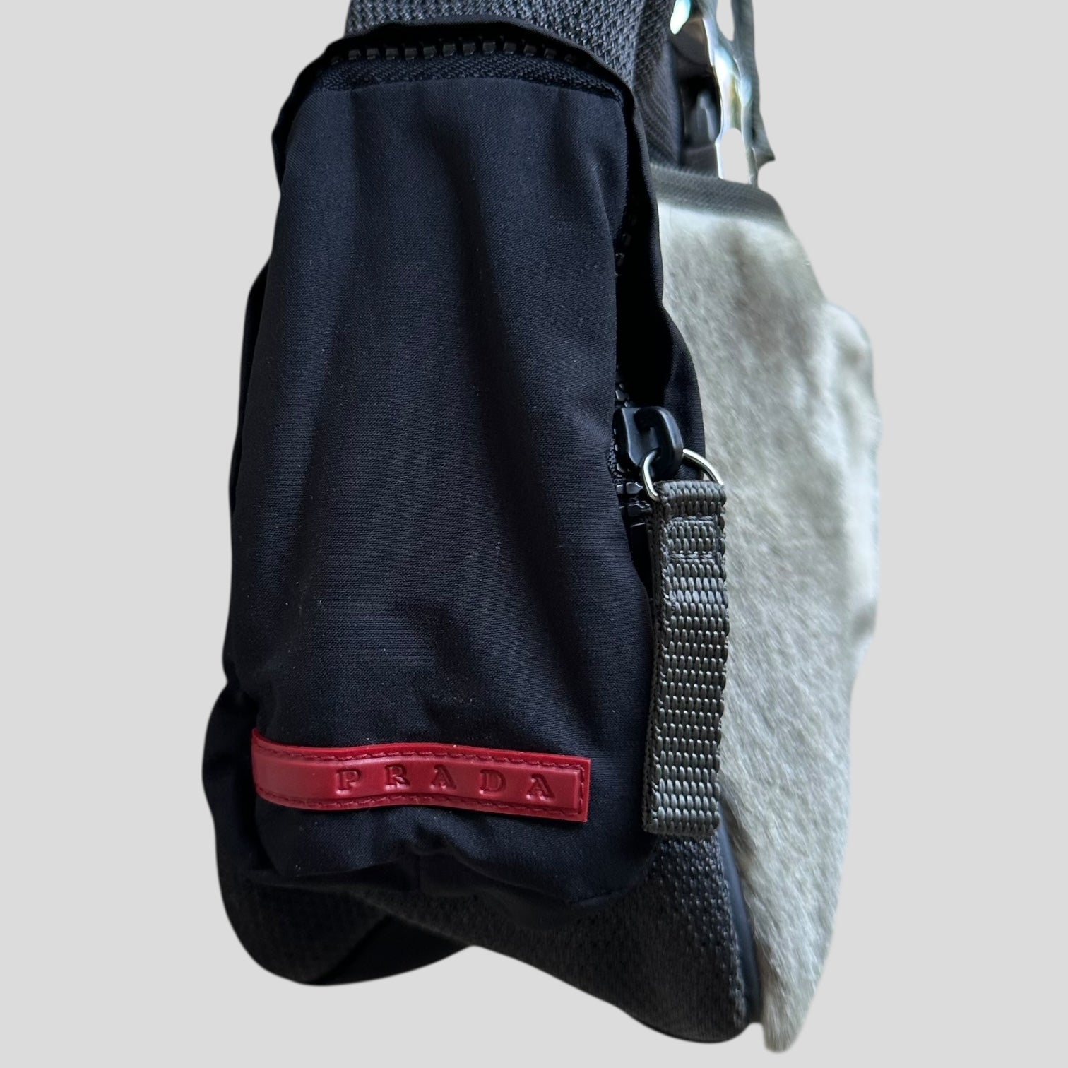 Extremely rare Prada Sport 2004 real goat fur handbag with super cute Eskimo print, technical multipocket hand bag with loads of storage, mesh detailing and silver metal buckles, incredible quality piece.