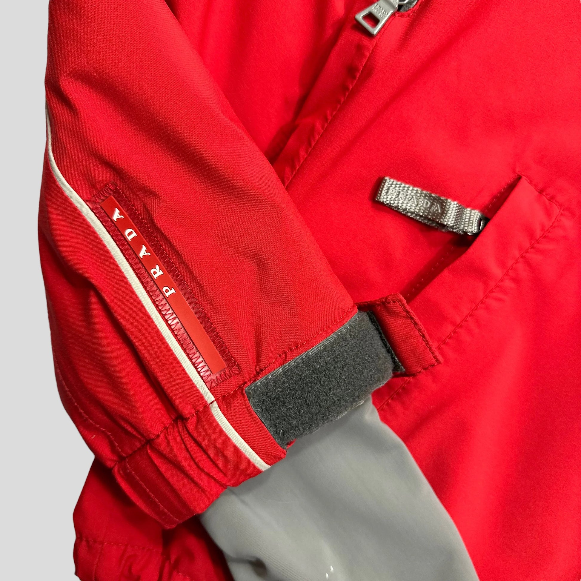 Extremely rare Prada Sport 2007 Piped detailing red and grey ski jacket, fully waterproof goretex constriction, down fill padded for warmth, endless amount of technical features from ventilation zips to hidden pockets everywhere you look, rubberised Prada red tab logos to wrist and back of hood, grey logo zippers on pockets, hood can be zipped off and stowed in a pocket.