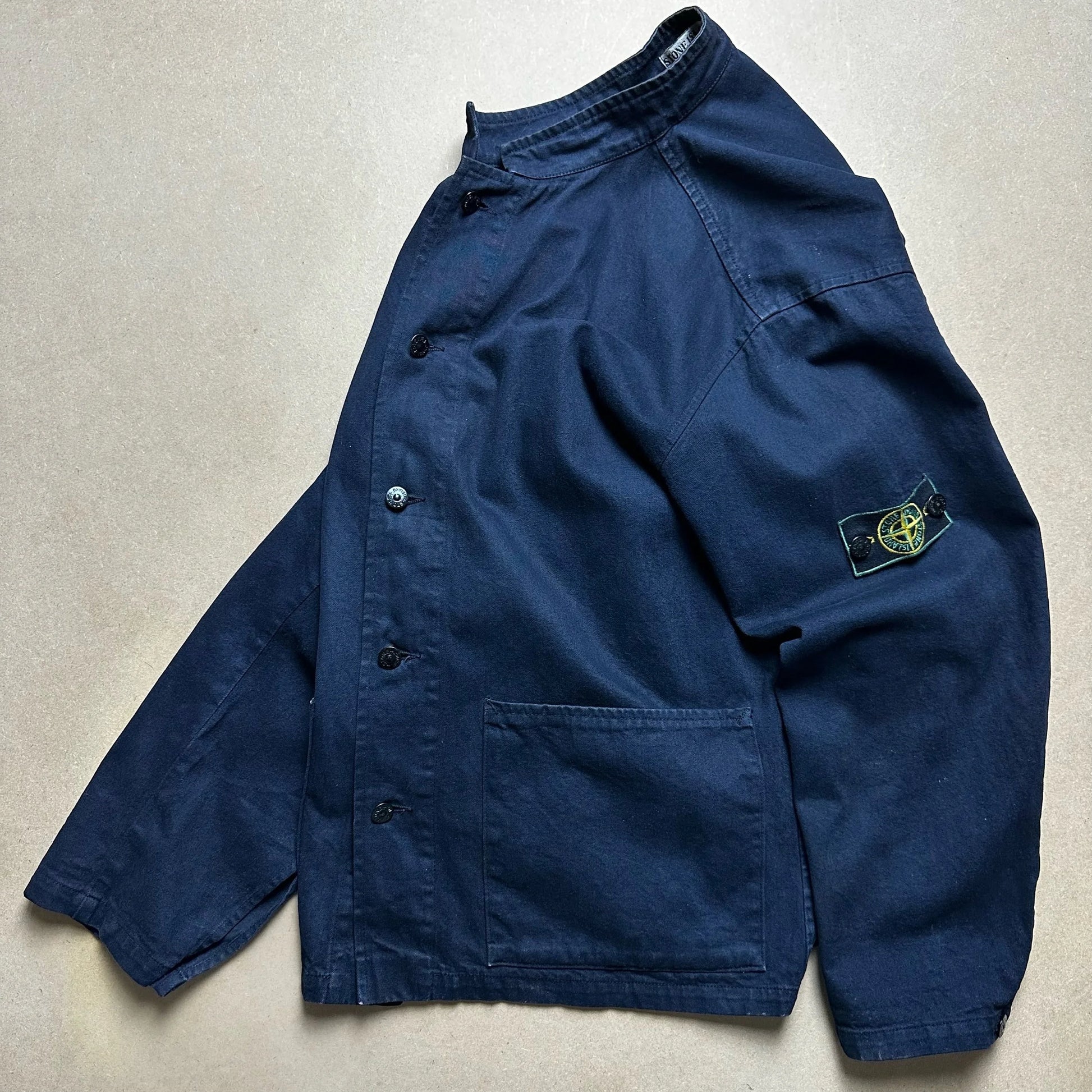 Designed by Massimo Osti. Inspired by Japanese railway worker garments of the 1940s featuring large metal engraved press stud buttons. Open patch pockets. Low cut round collar complete with an embroidered rear Marina spell out.