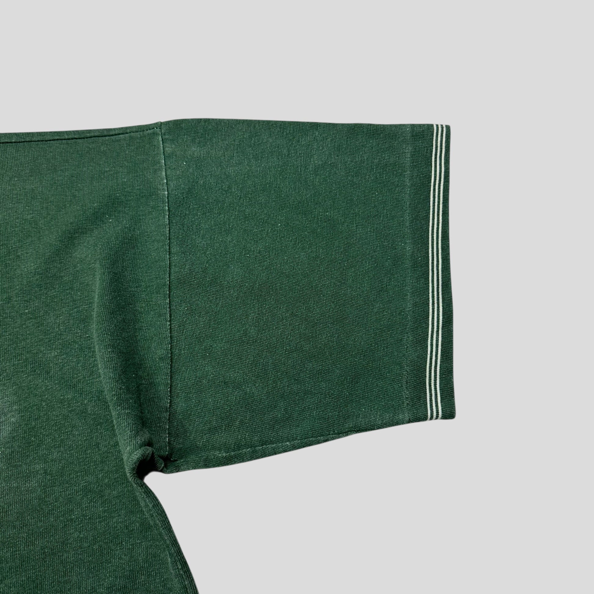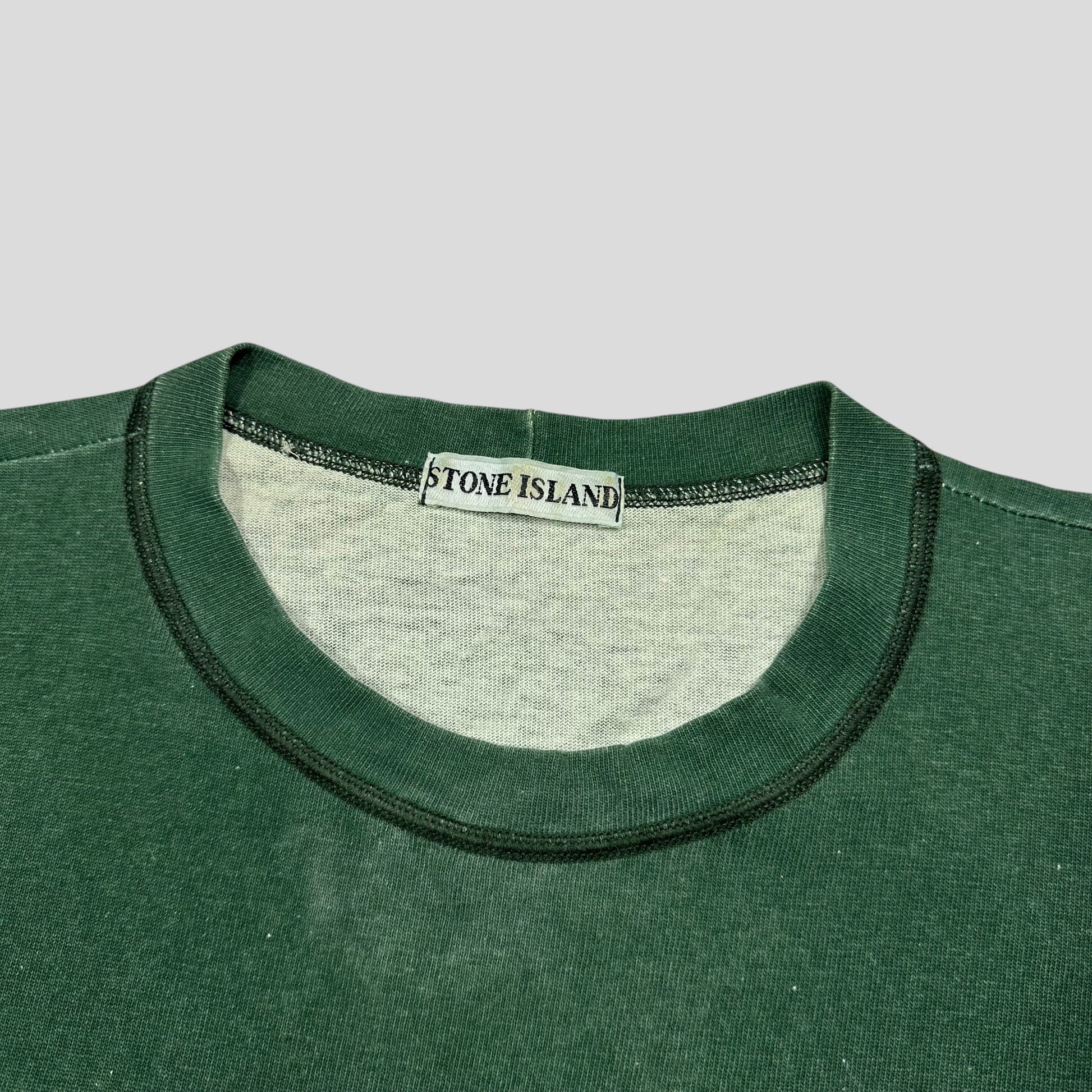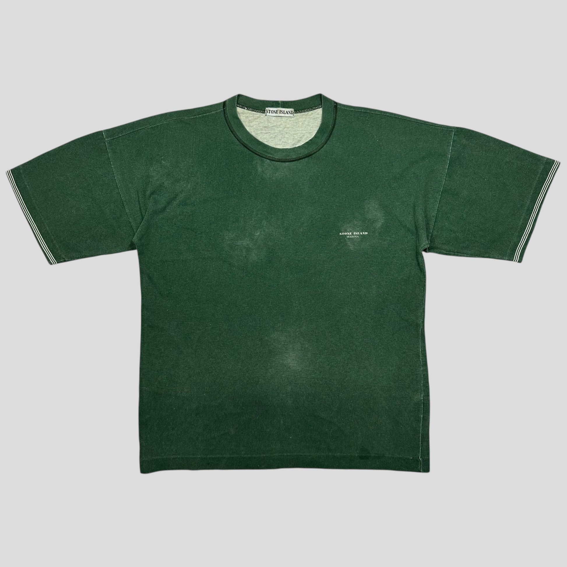 Very rare 1989 green washed cotton Stone Island tee, striped Marina detailed sleeves, logo to chest, beautiful boxy fit with wide sleeves, 80’s style.