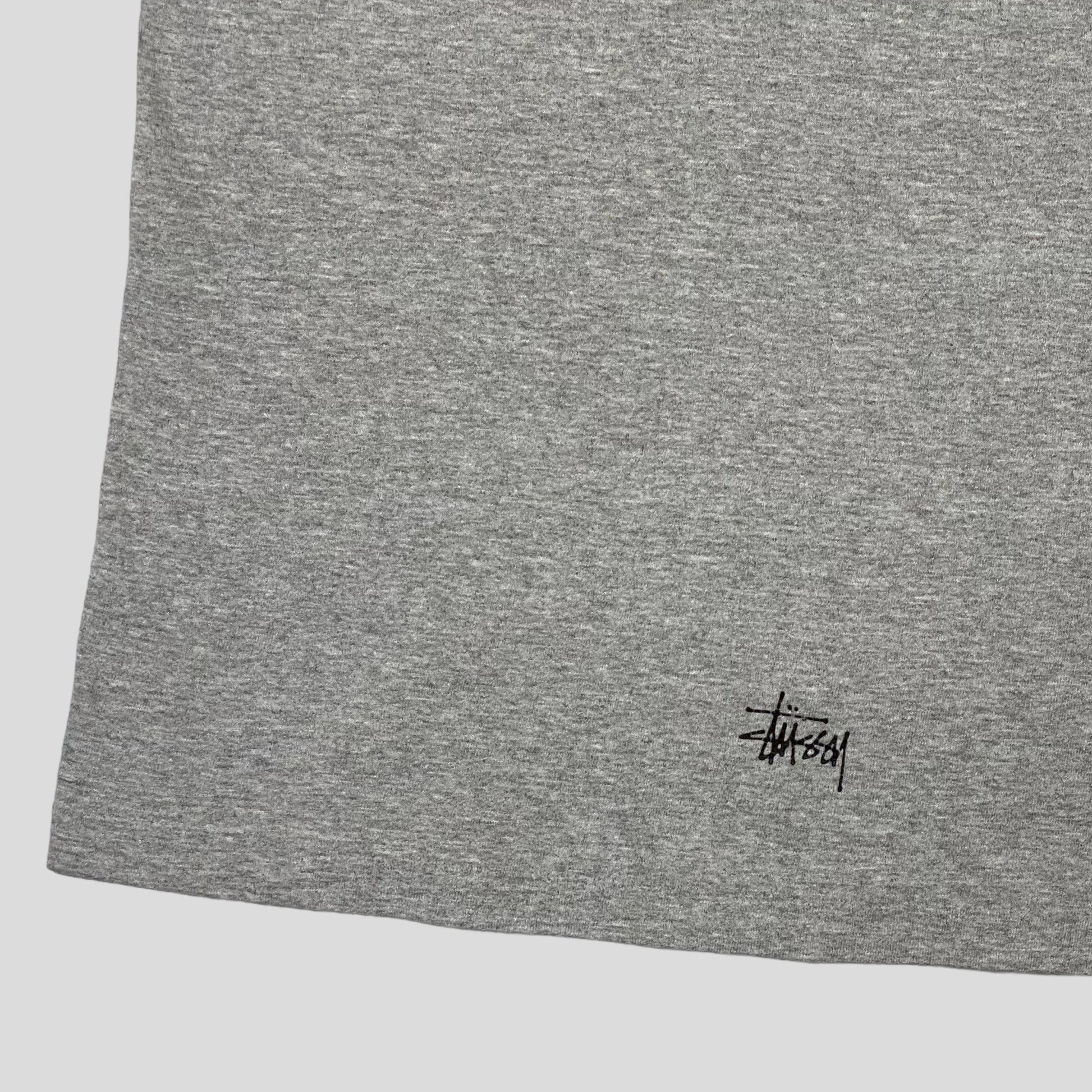 Rare Stussy 01 2001 double sided graphic tee, mirrored print on the reverse with a mini Stussy stock logo by the hem.