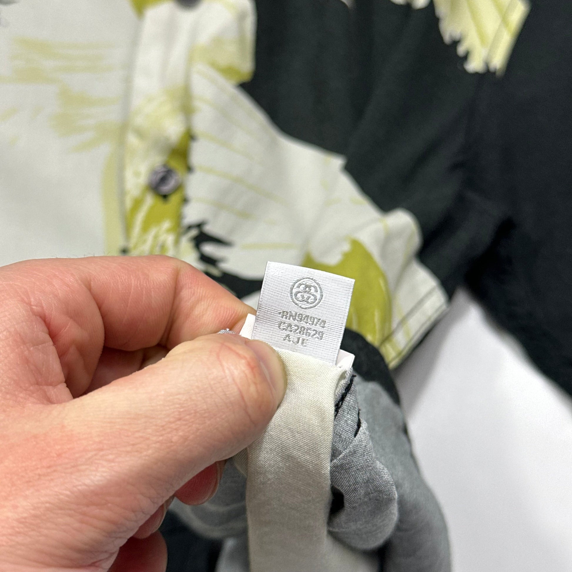 Lovely crane birds graphic, charcoal black soft rayon Stussy shirt, open collar boxy fit with straight hem, Stussy logo tag to hip, lightweight.