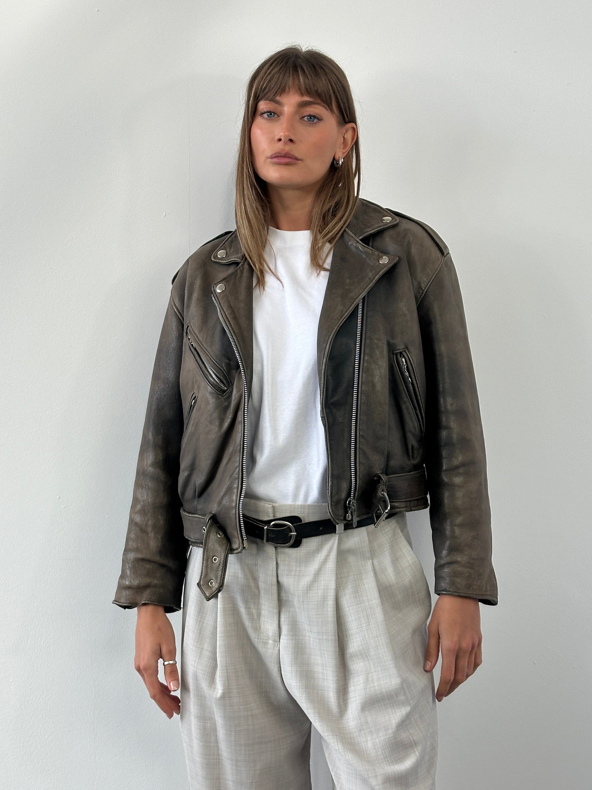 Vintage 1980s women’s leather biker jacket in a natural taupe tone black tone. A structured cropped silhouette with a classic biker shape and a lightly padded interior.