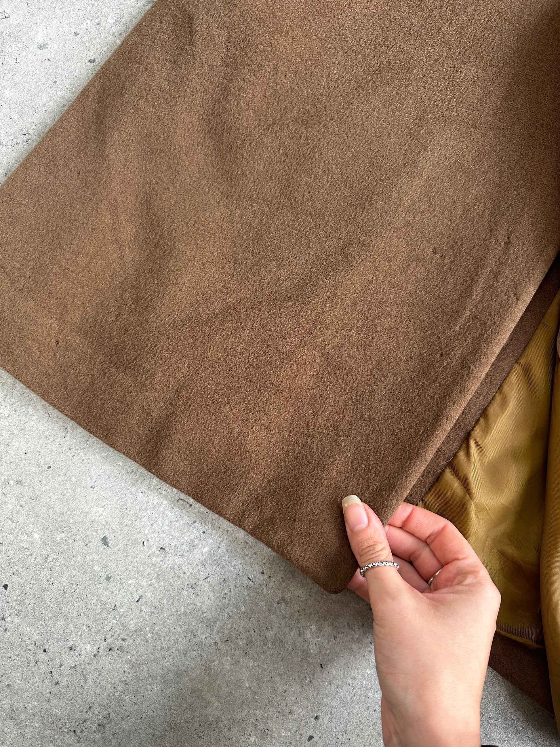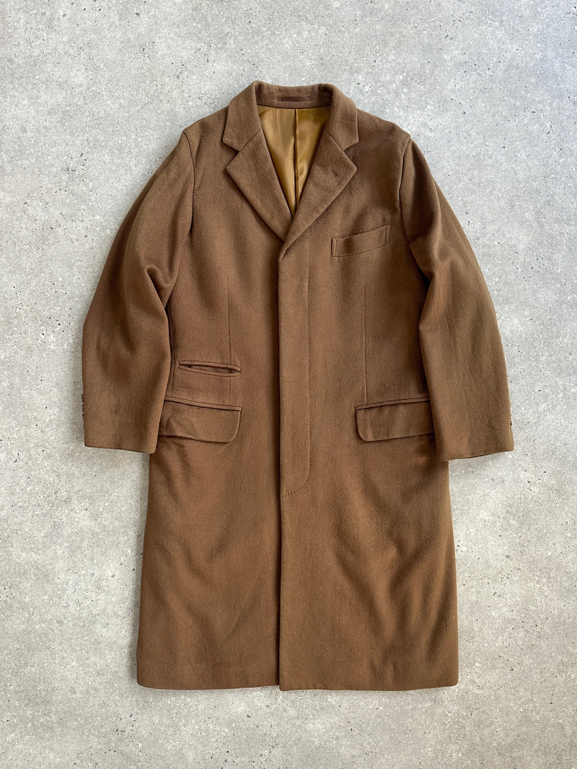 Vintage 1980s brown pure cashmere coat by Abruzzesi Uomo featuring Italian-woven cashmere fabric. Features a clean concealed placket and relaxed shoulders that reflect high-quality Japanese tailoring.