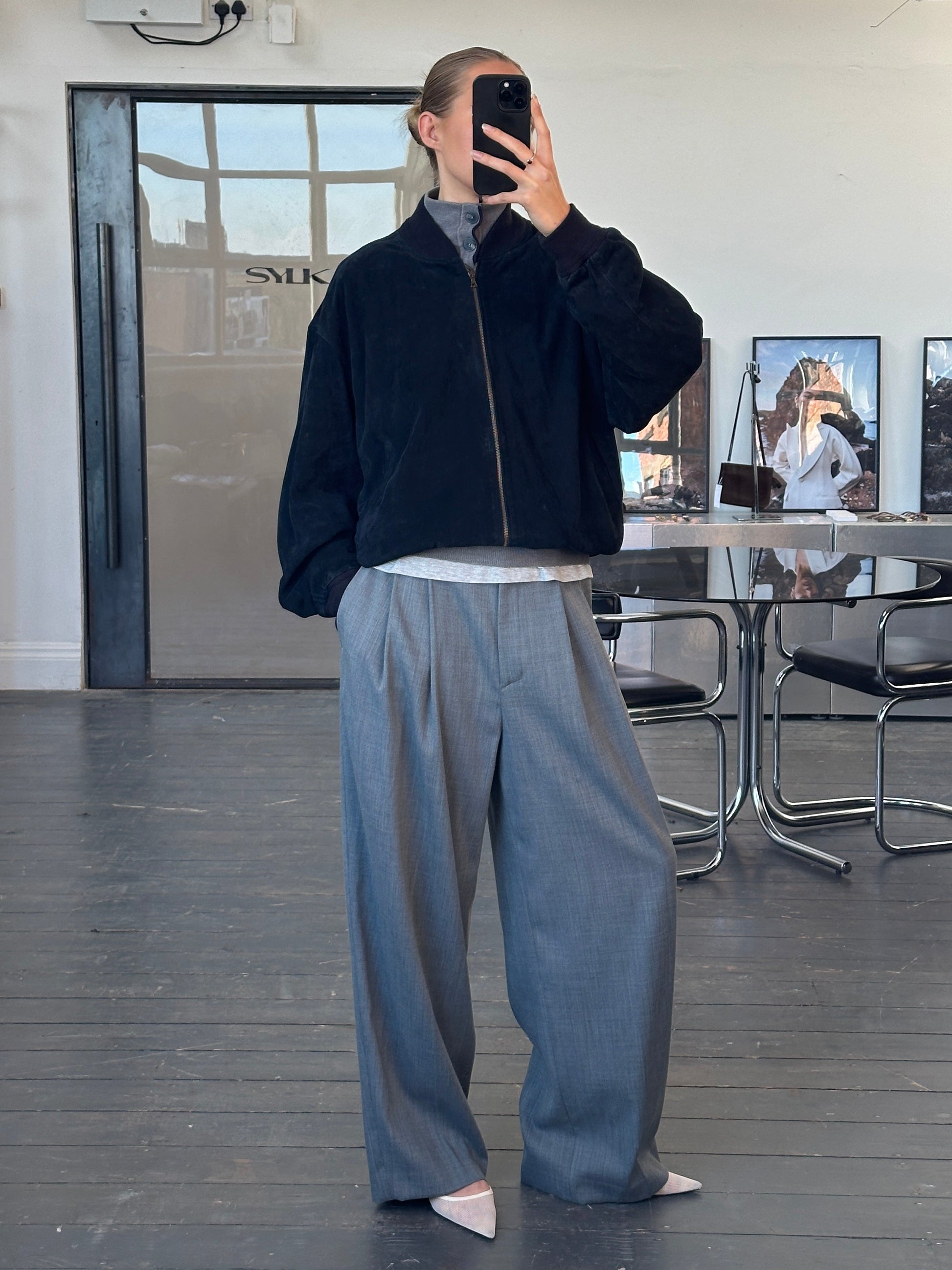 A deep navy tone suede bomber with a clean minimal silhouette and ribbed trims. Vintage 1980s styling with a contemporary quiet luxury feel and softly structured shape.