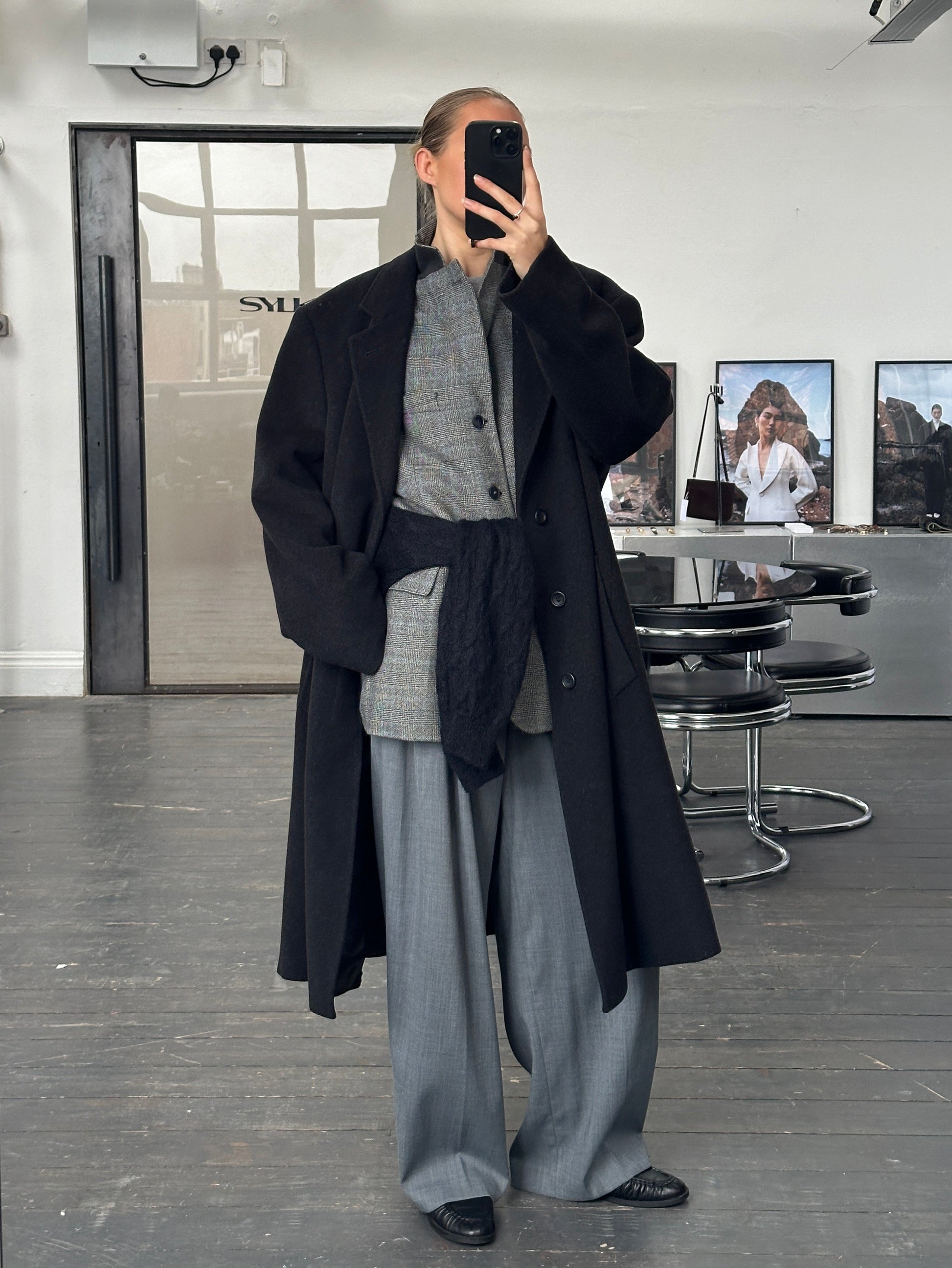 A 1990s Varteks International dark grey coat with a minimalistic concealed placket and structured shoulders, crafted in a soft cashmere blend for a refined winter layer.