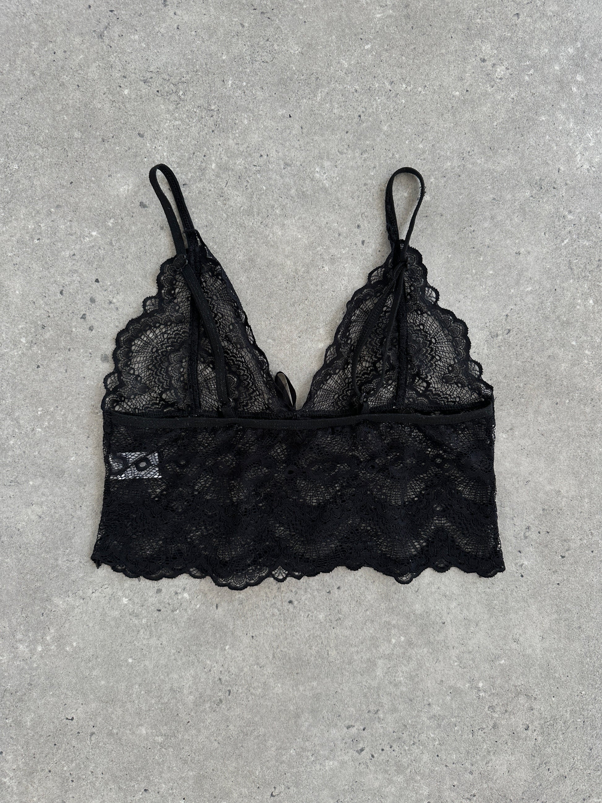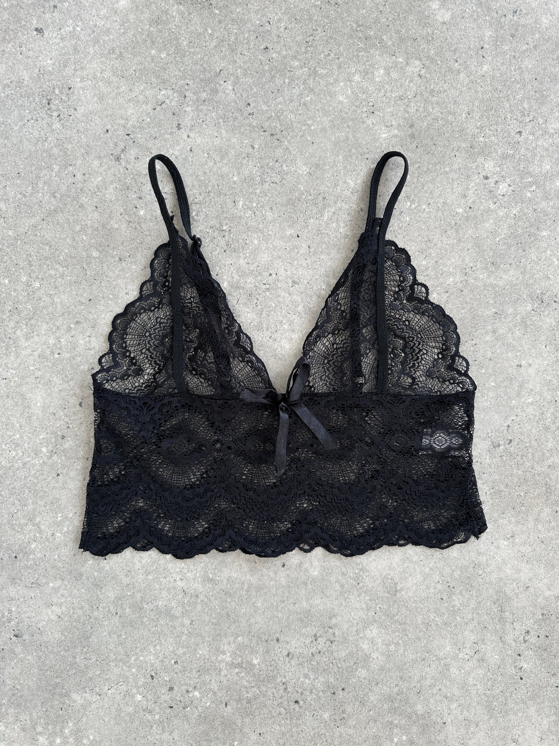 Delicate black lace bralette with scalloped hem and satin bow detailing — perfect for layering or lounge.
