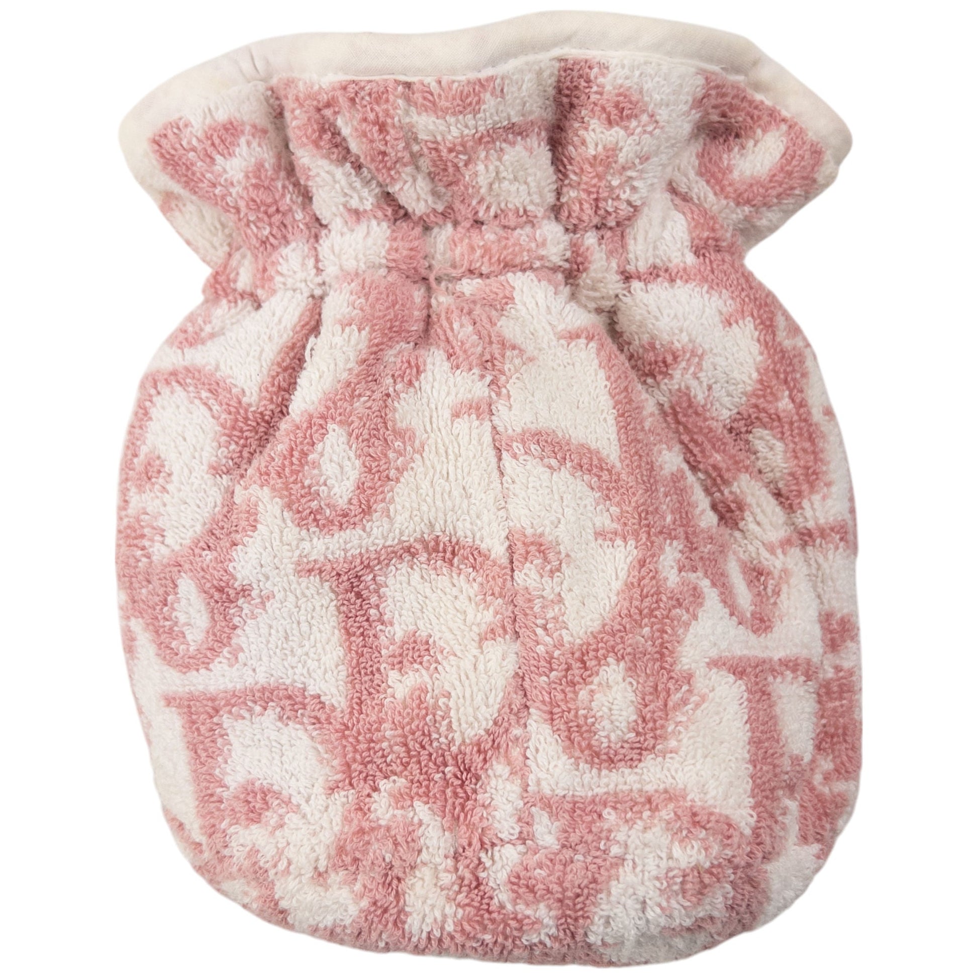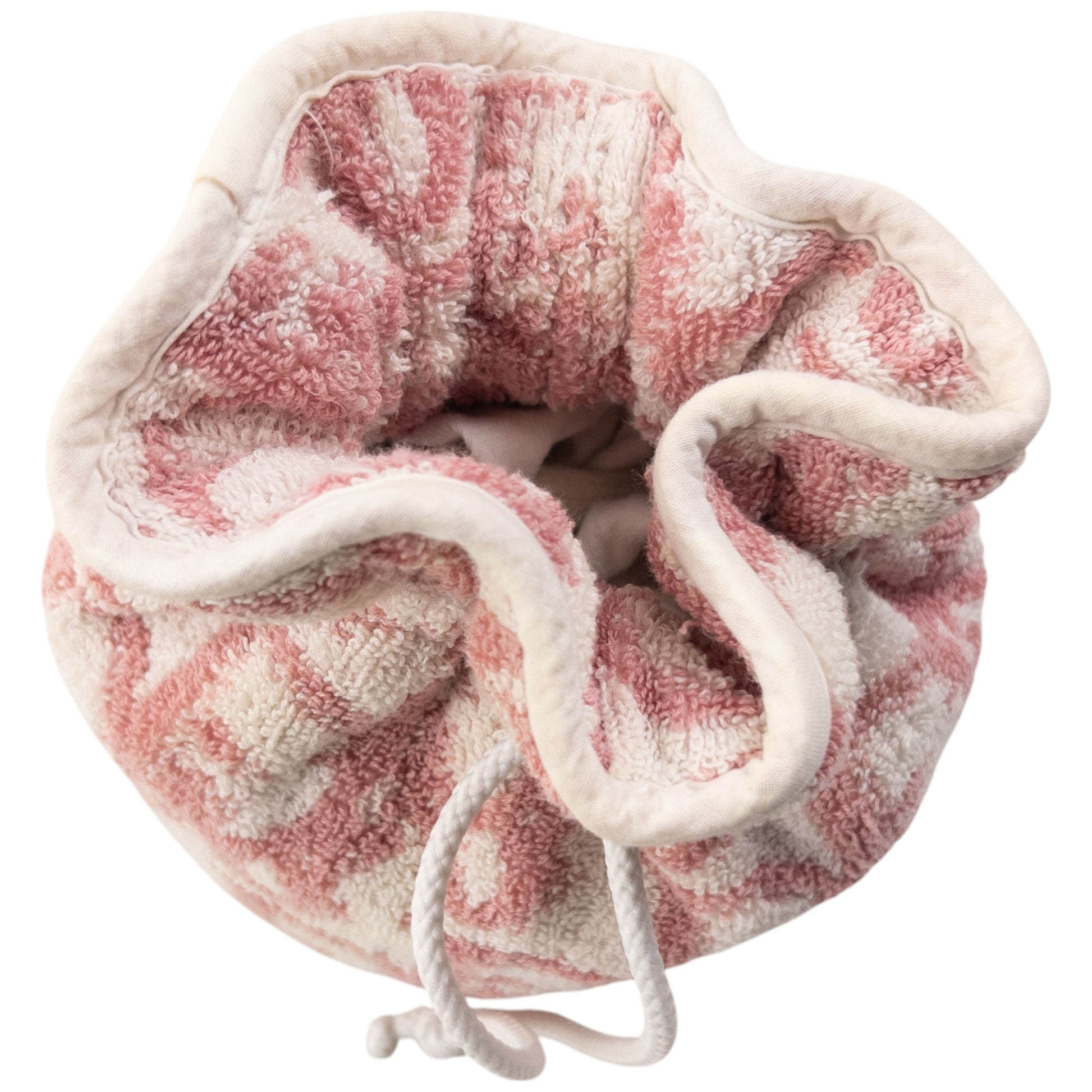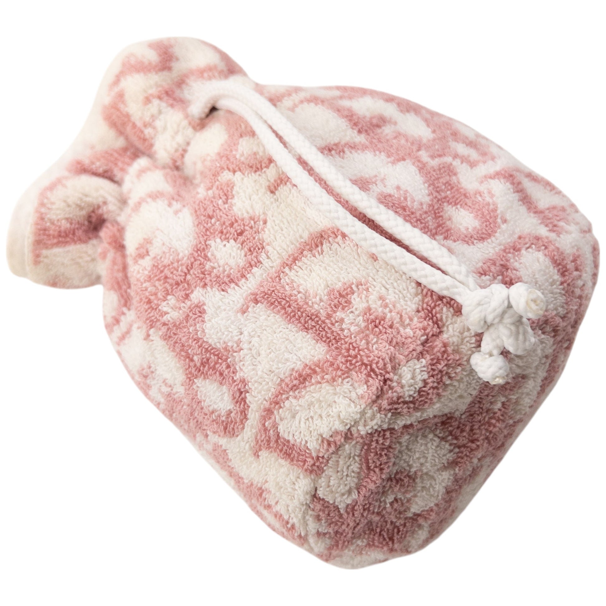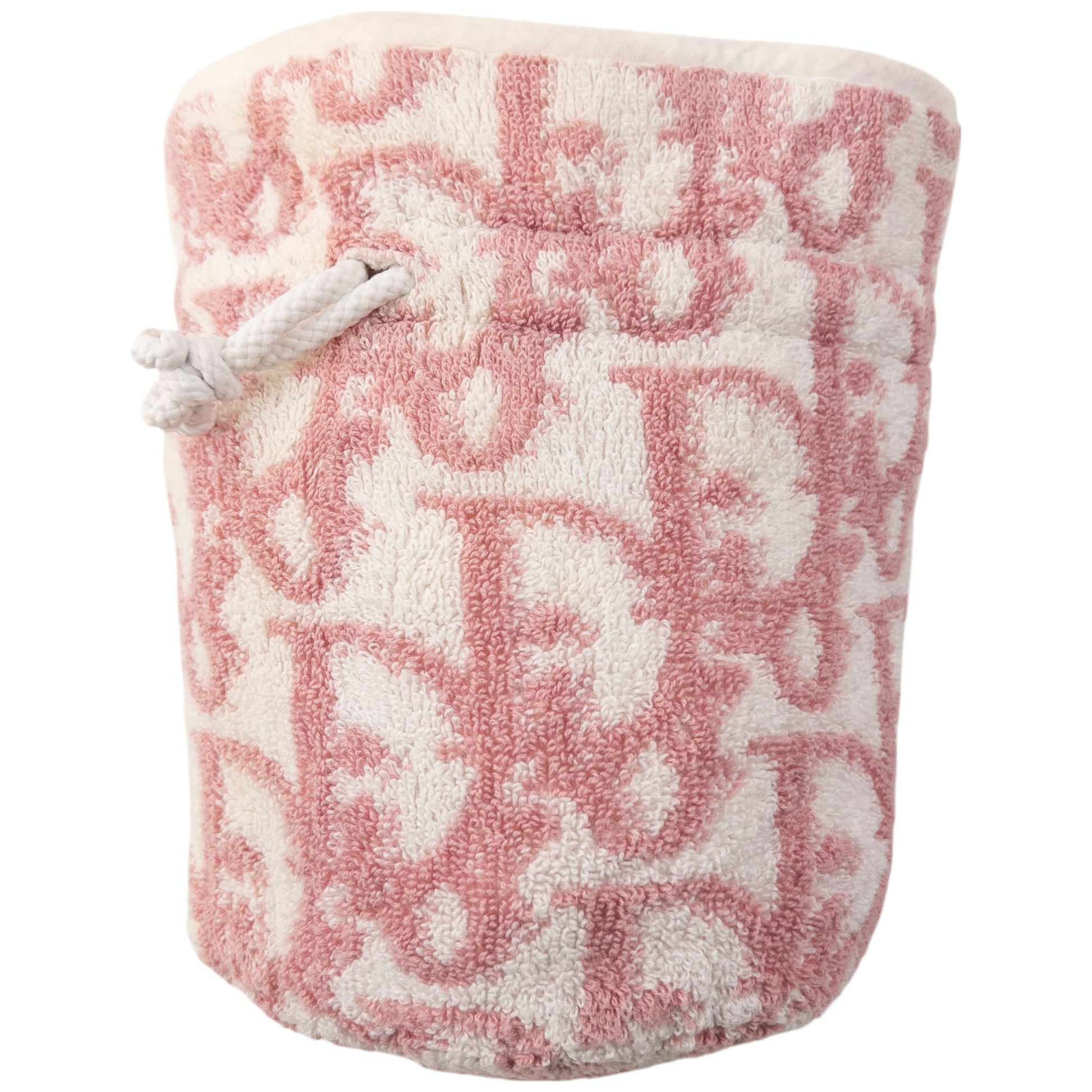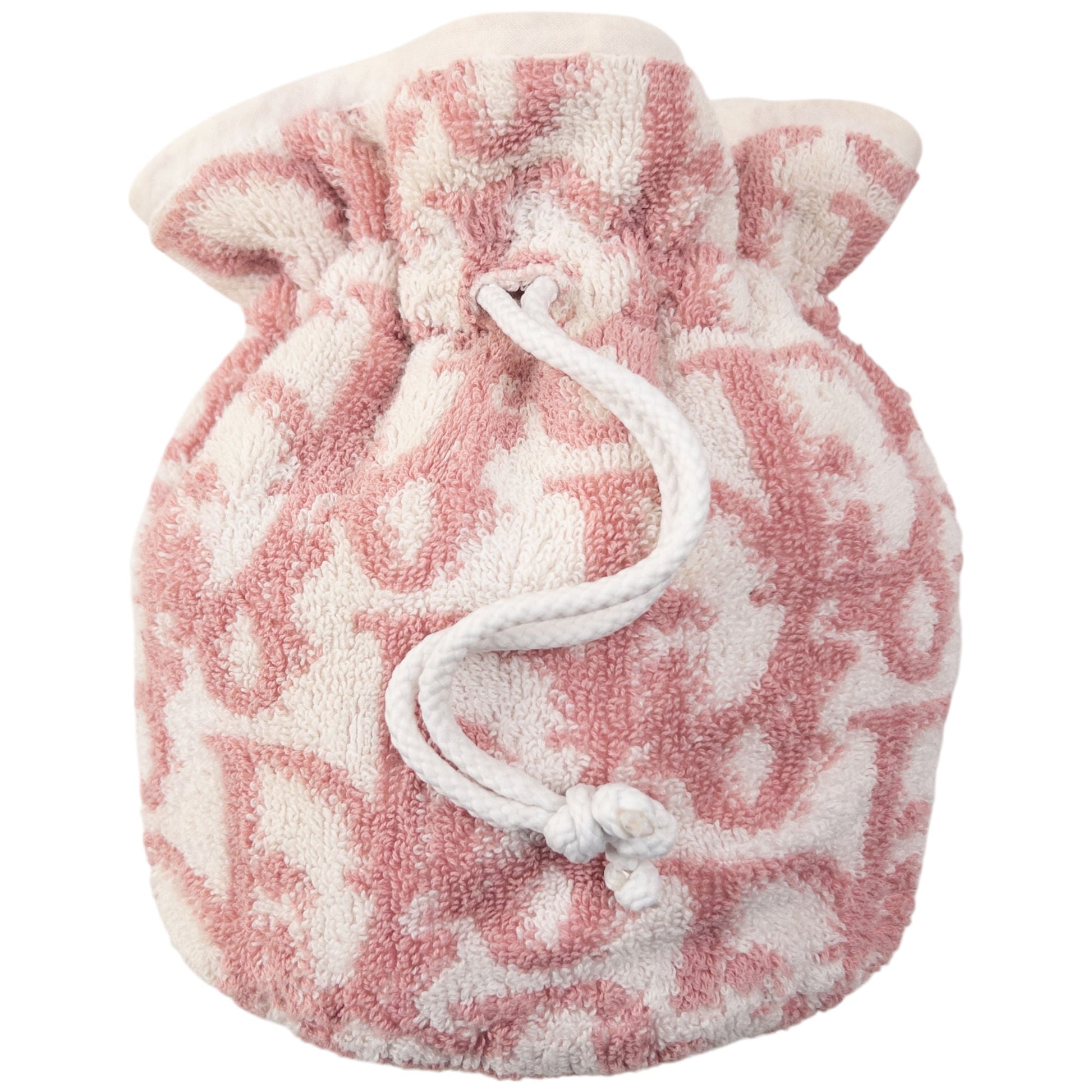 • Other info: White colour, pink contrast colour, monogram logo pattern, drawstring closure, waterproof lining, towelling texture