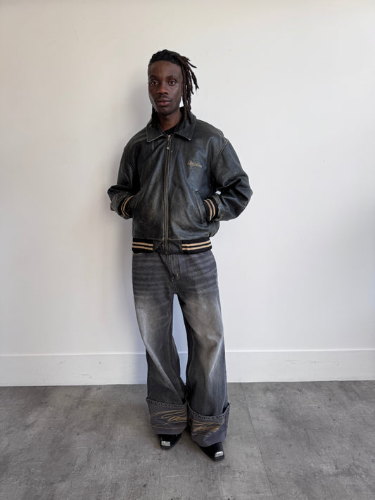 Mangoon 1990's Patch Embellished Black Distressed Leather Bomber