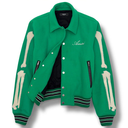 AMIRI LOGO-EMBOIDERED APPLIQUÉD BONE WOOL JACKET GREEN / WHITE 50 / L