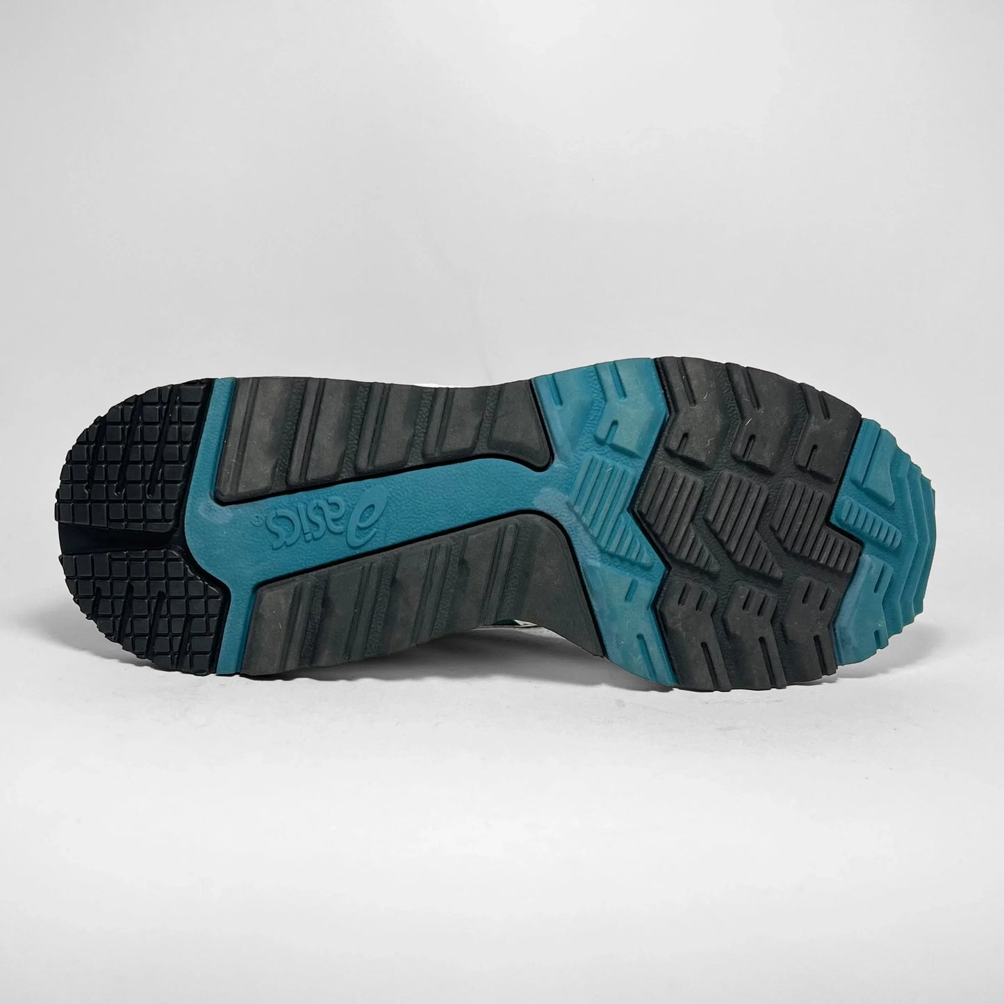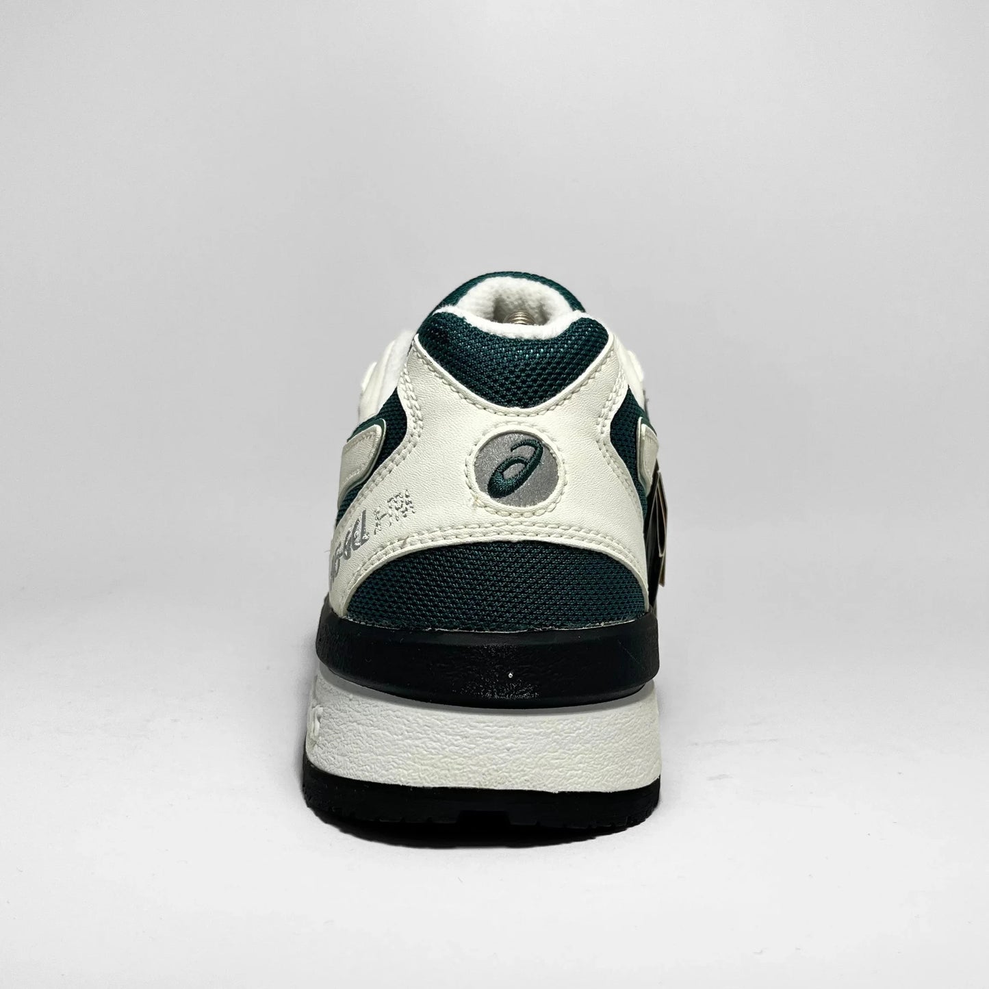 Soft leather panels with green outlined underlay and mesh base, tongue including embroidered branding also on heel, embossed streamlining and oceanic outsole.
