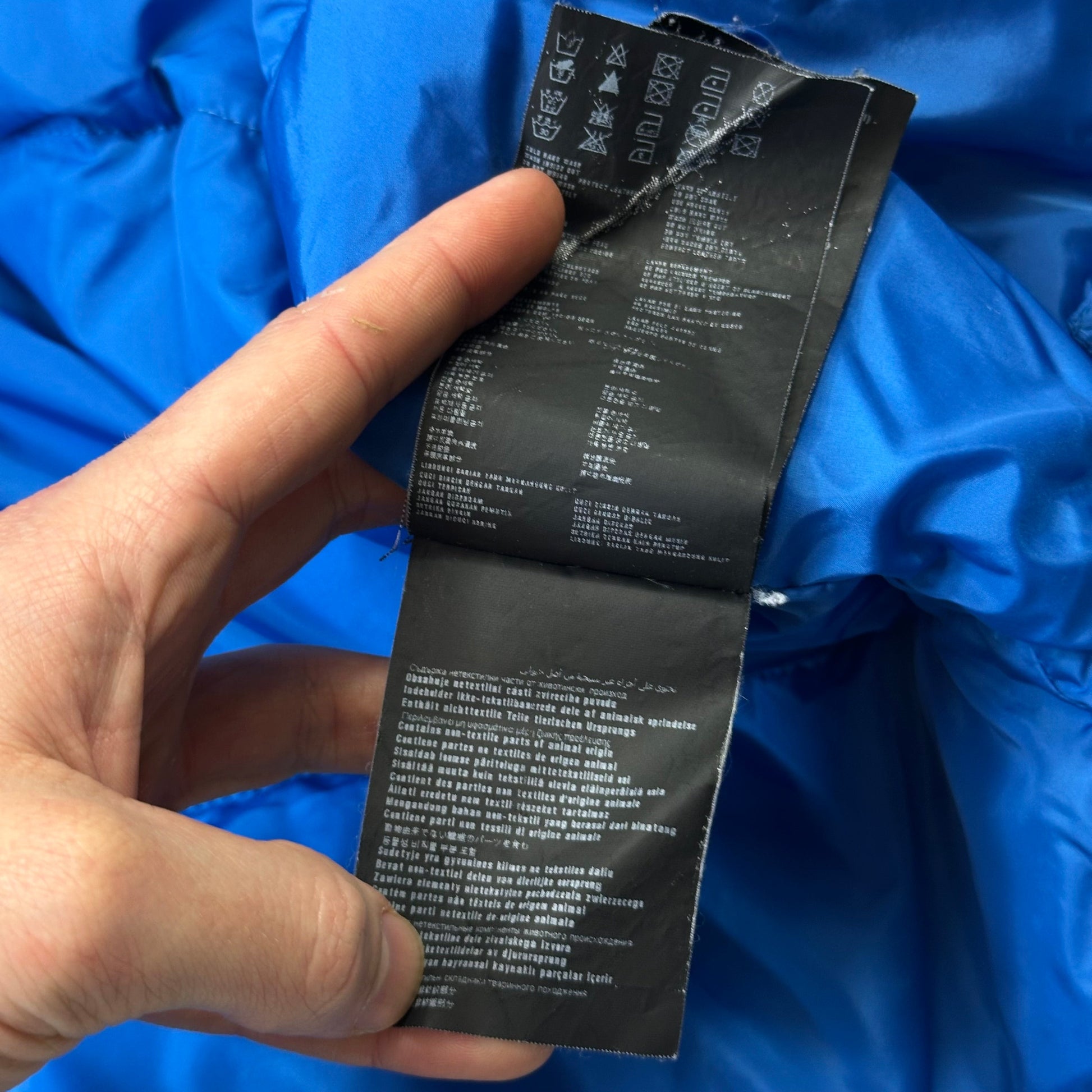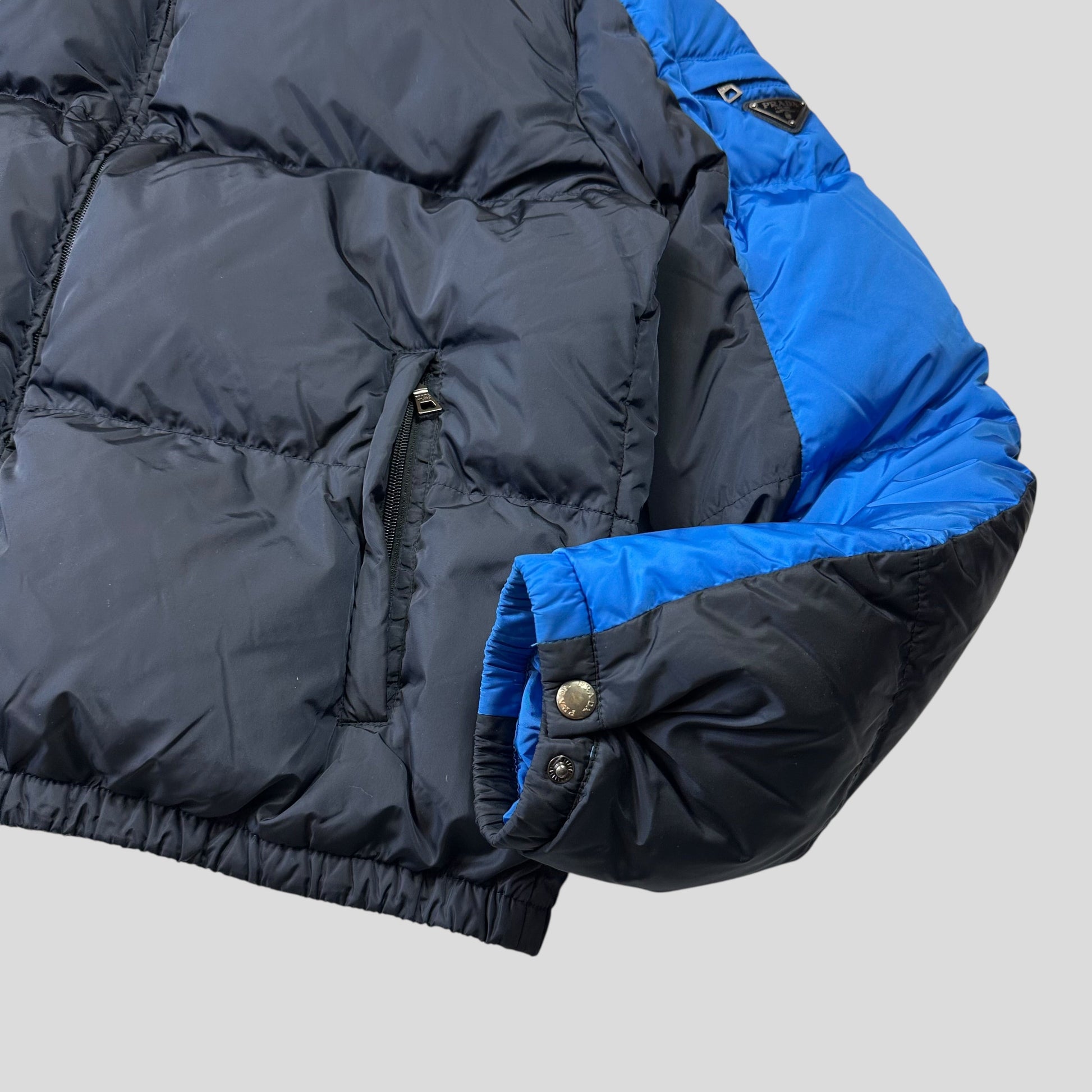 Extremely rare Prada 2012 Milano mainline midnight navy and royal blue nylon elder goose down puffer jacket, by far one of the rarest Prada puffers we’ve owned, bi-colour panels with the triangle plaque logo to the arm pocket, thick warm down, zip hand pockets and inside pockets, packable nylon hood with pop button Prada collar.