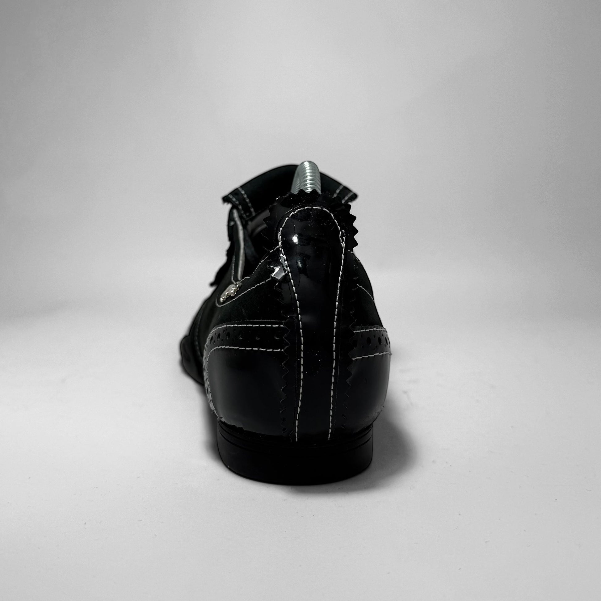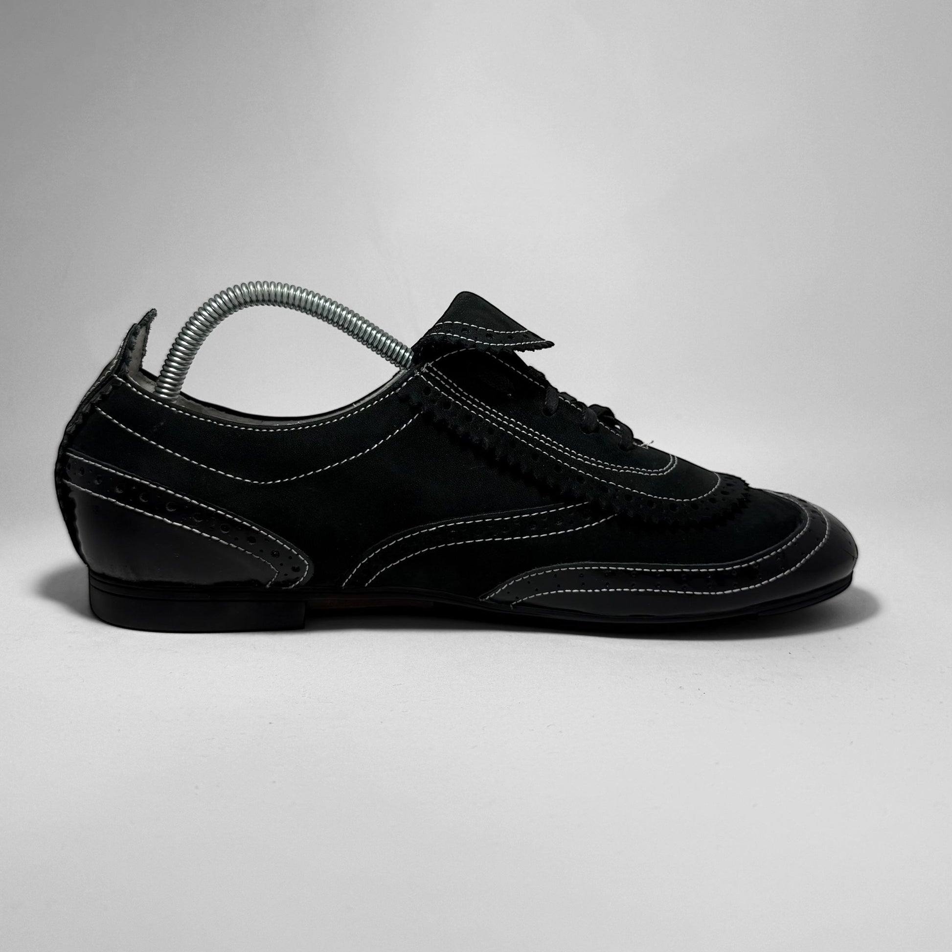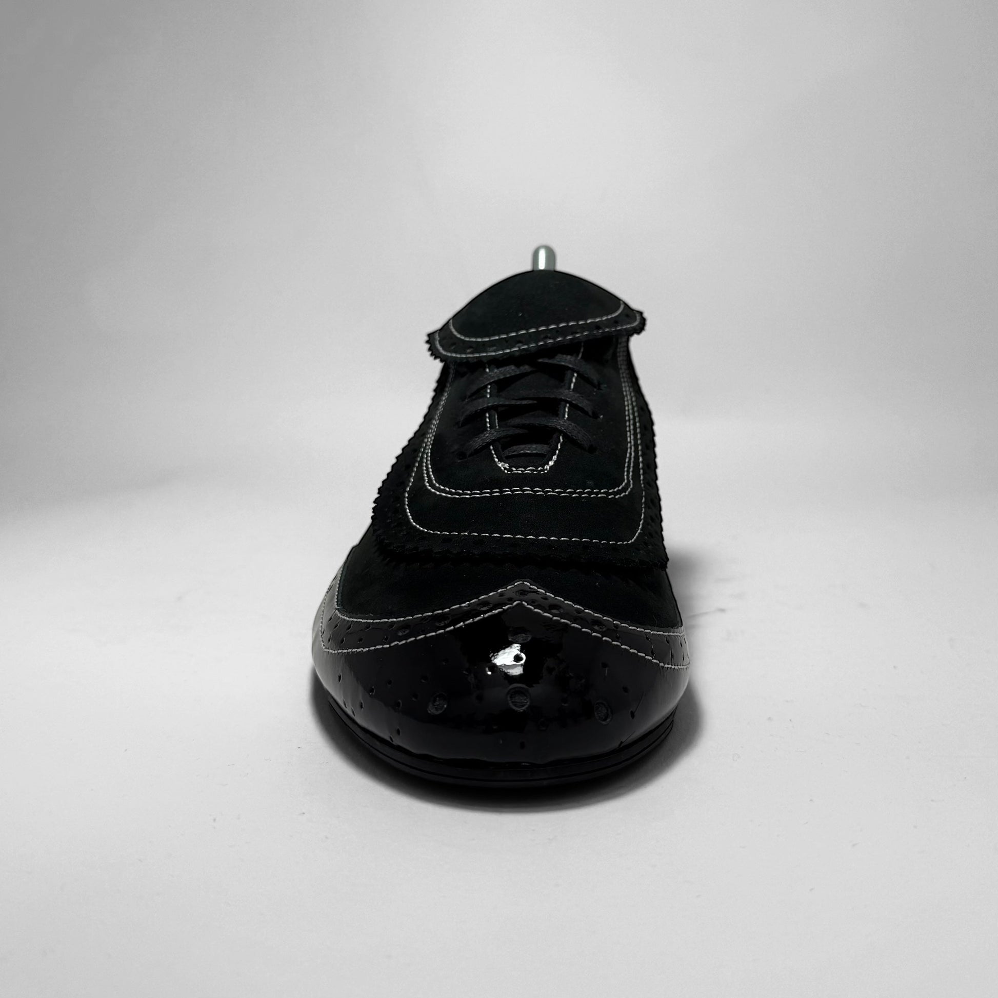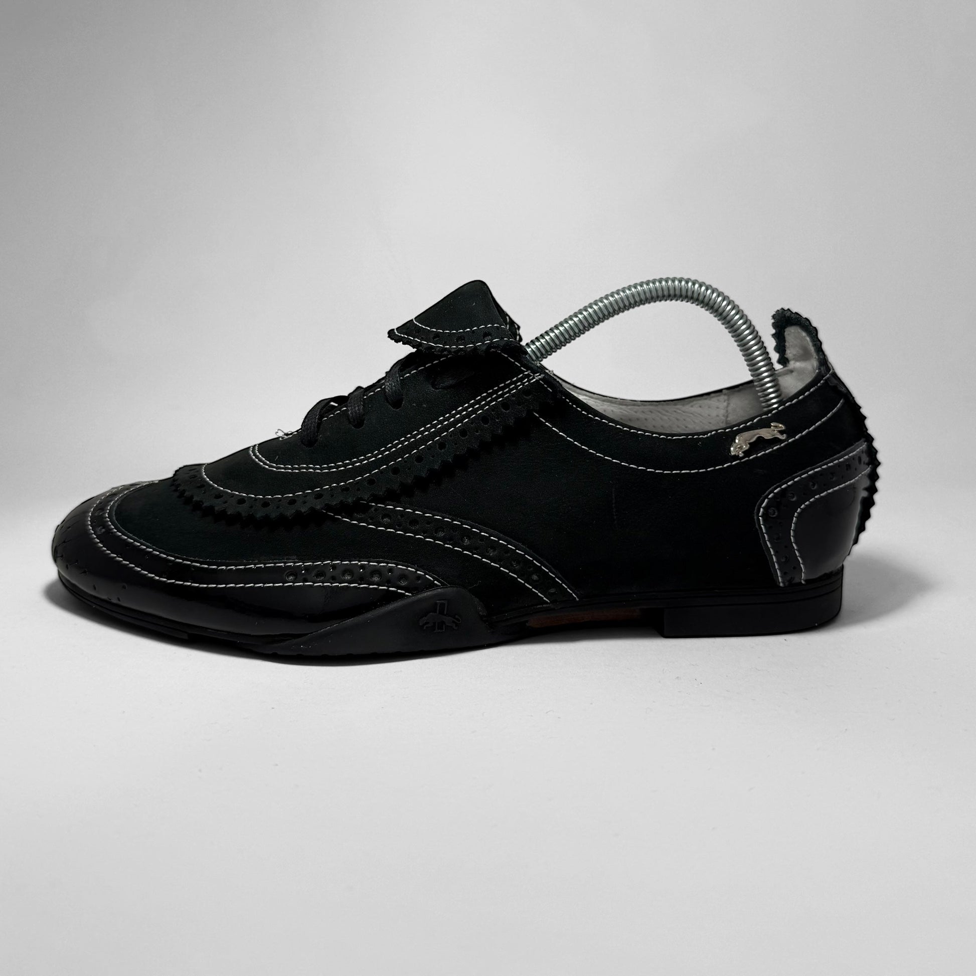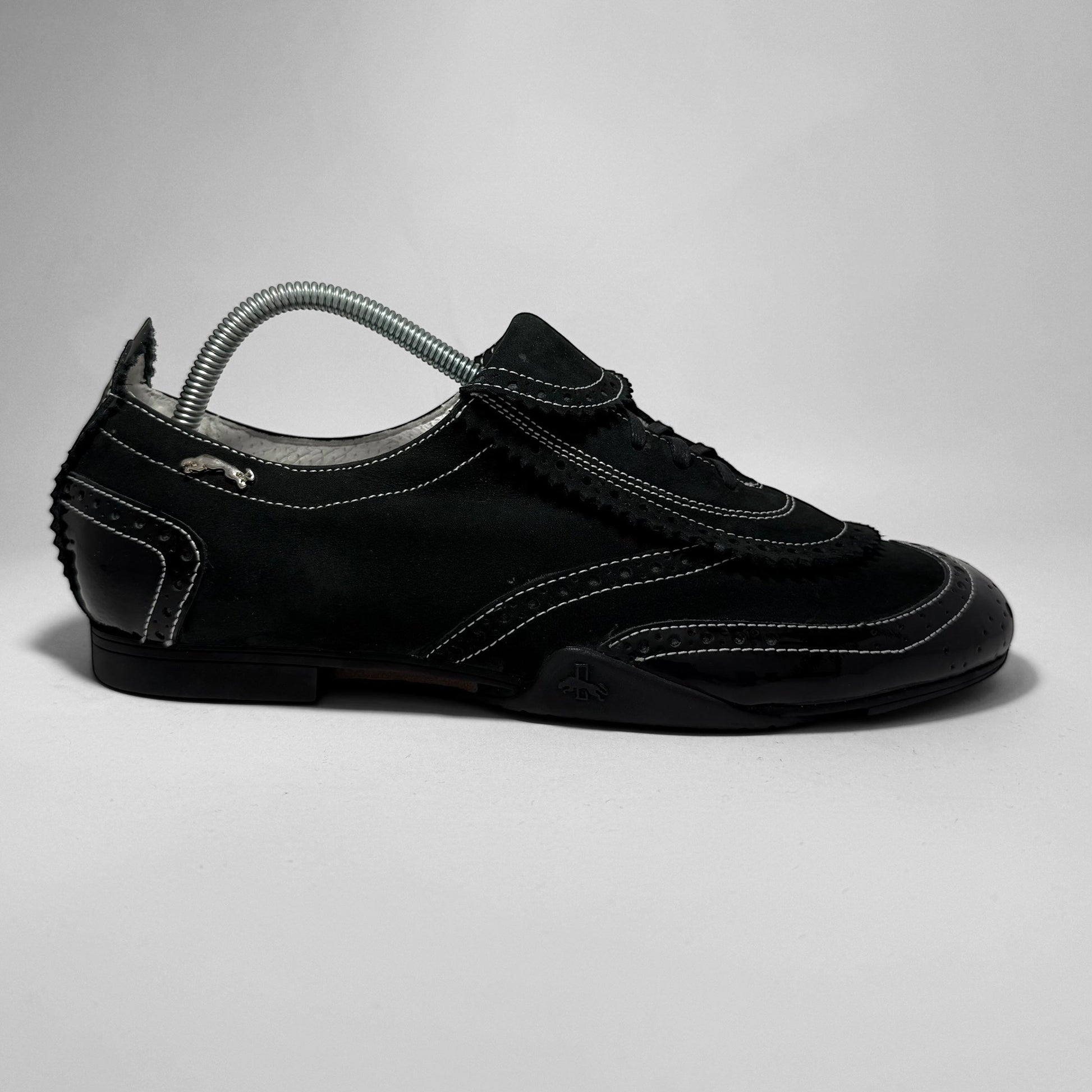 Low-top hybrid sneaker in black suede and patent leather. Features brogue-style paneling, contrast white stitching, and classic Dassler metal and outsole branding.