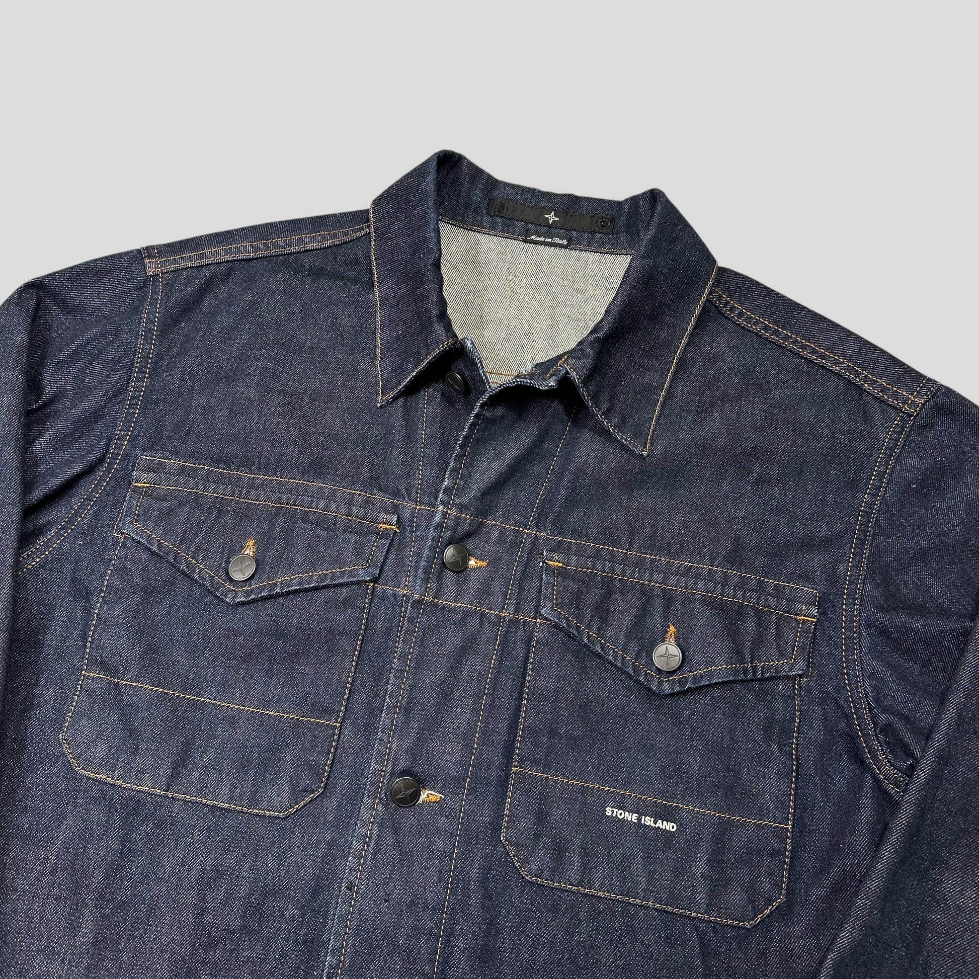 Rare early 2000’s Stone Island indigo denim trucker jacket, spellout logo to chest pocket, made in Italy, metal compass logo buttons, double chest pockets.