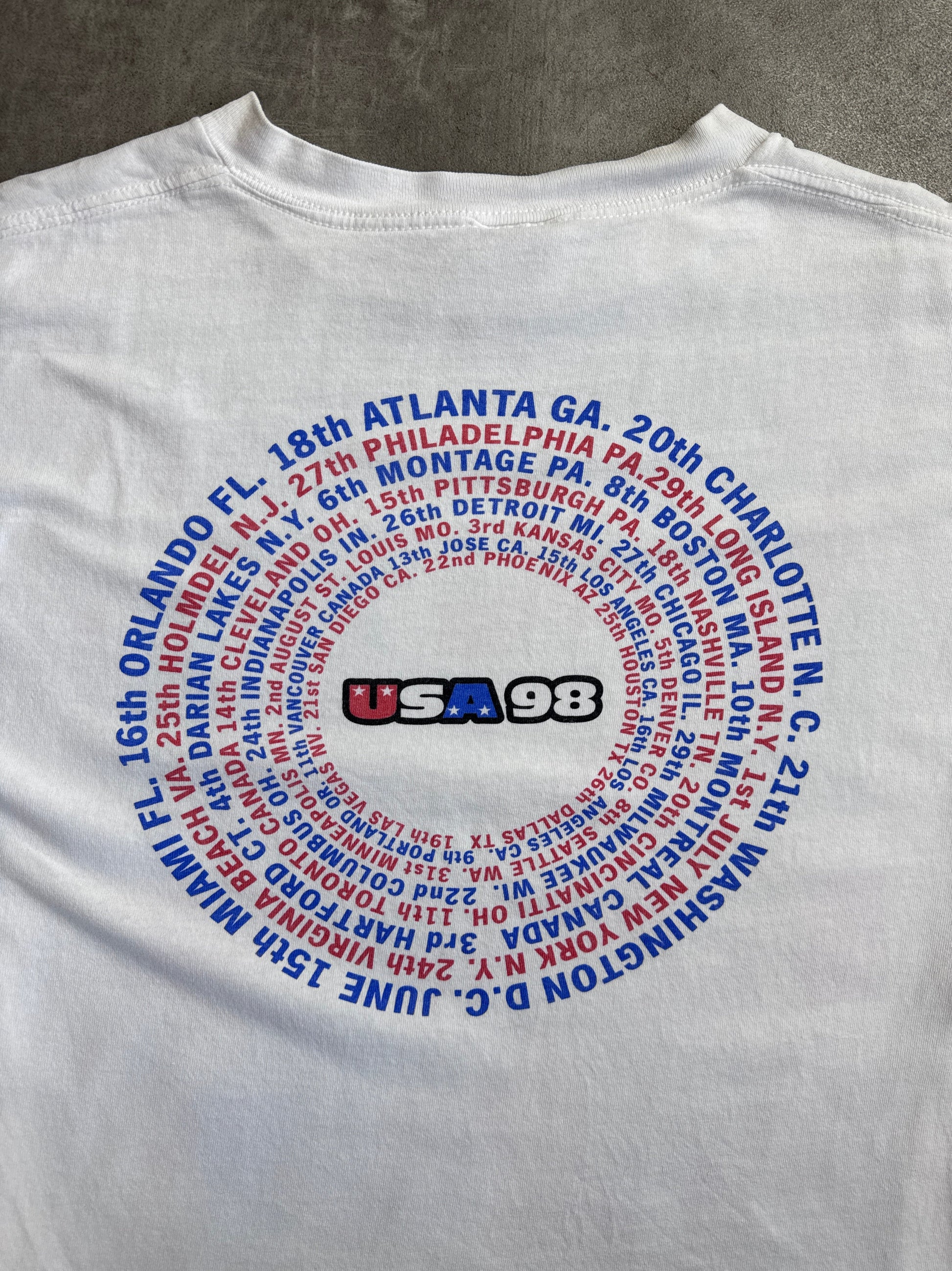 A true piece of late-90s pop culture history, this Spice Girls 1998 Tour graphic tee is the perfect blend of iconic girl-band nostalgia and authentic vintage construction. Printed on a classic Tultex cotton blank, it has that proper 90s drape and worn-in feel that collectors look for — bold graphic, soft fabric, and era-correct fit.