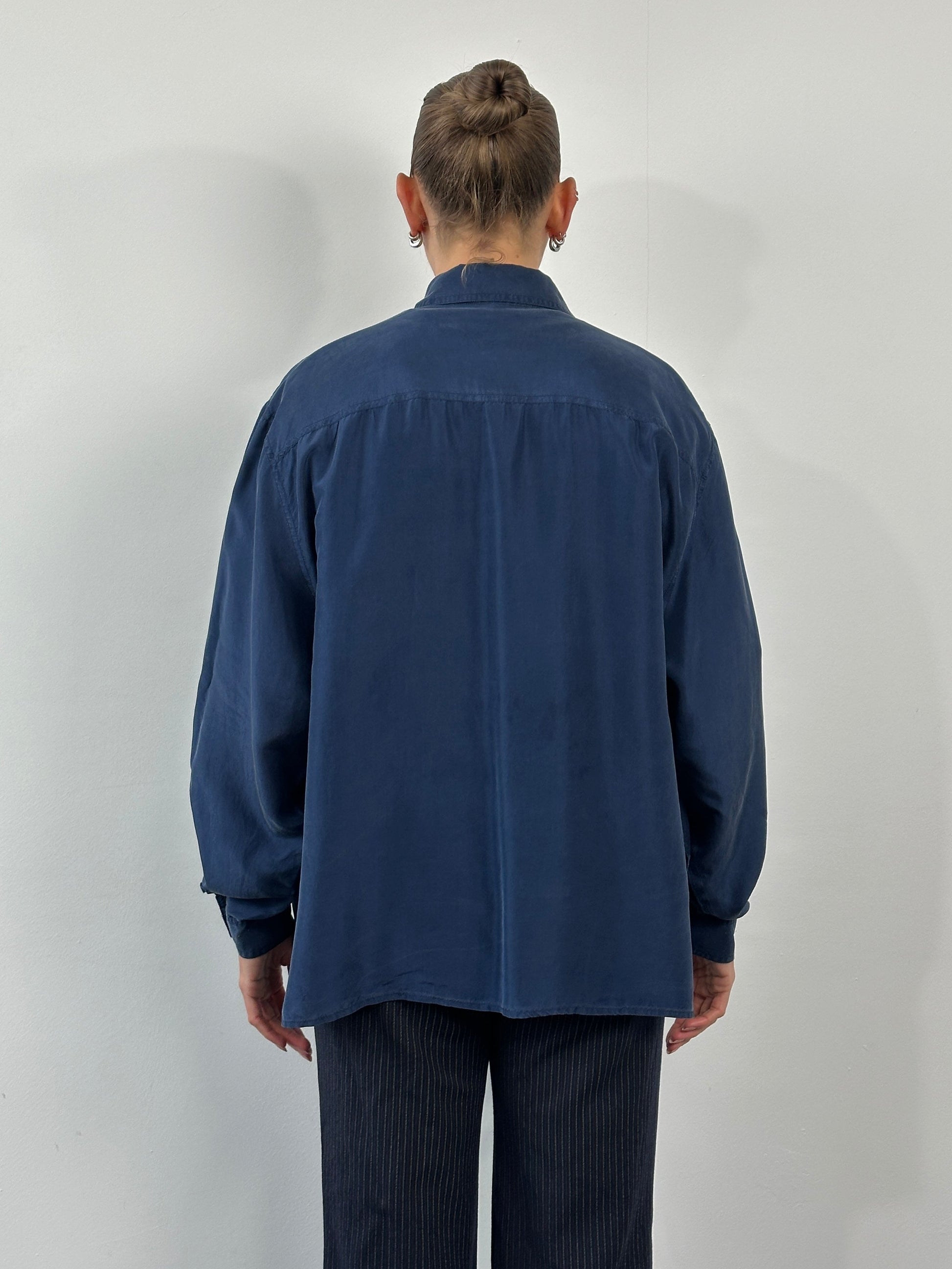 Vintage 1990s navy shirt by Catherine with a relaxed, fluid silhouette and soft sheen throughout. Designed with a classic pointed collar, full button front, and dual chest patch pockets. The fabric has a smooth, lightweight drape consistent with silk.