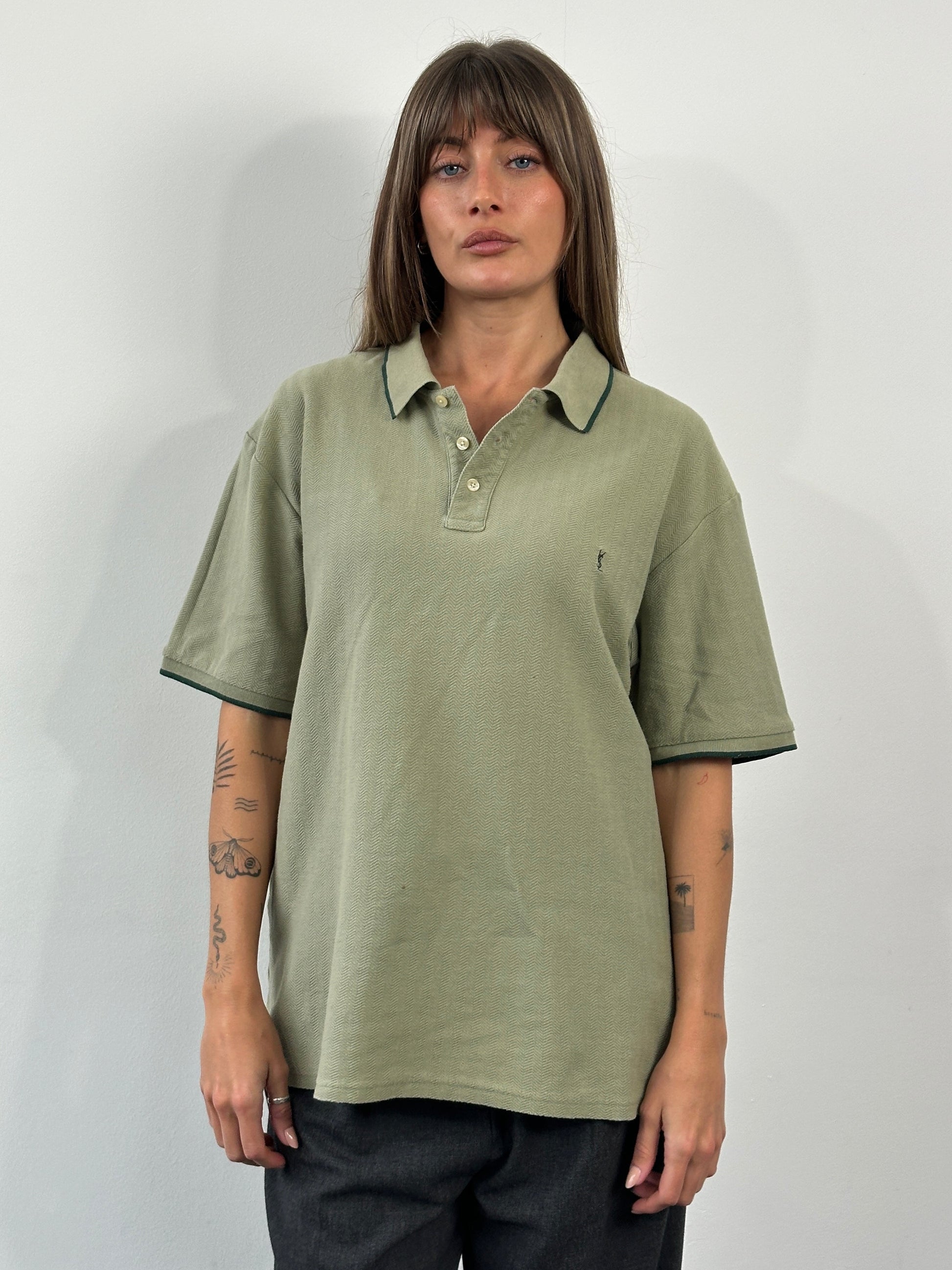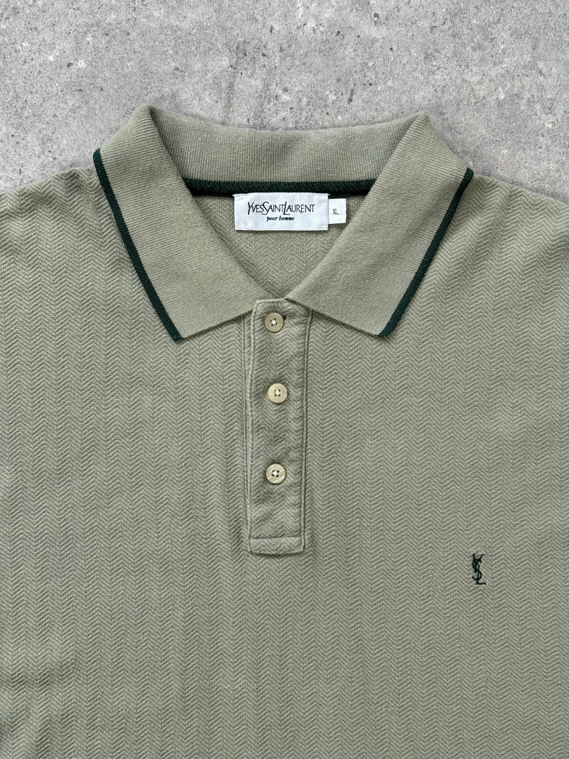 Yves Saint Laurent Pour Homme 1990s green cotton polo in a soft sage tone with dark green contrast trim at the collar. Crafted in textured woven cotton with embroidered chest logo and branded buttons, cut in a relaxed straight silhouette.